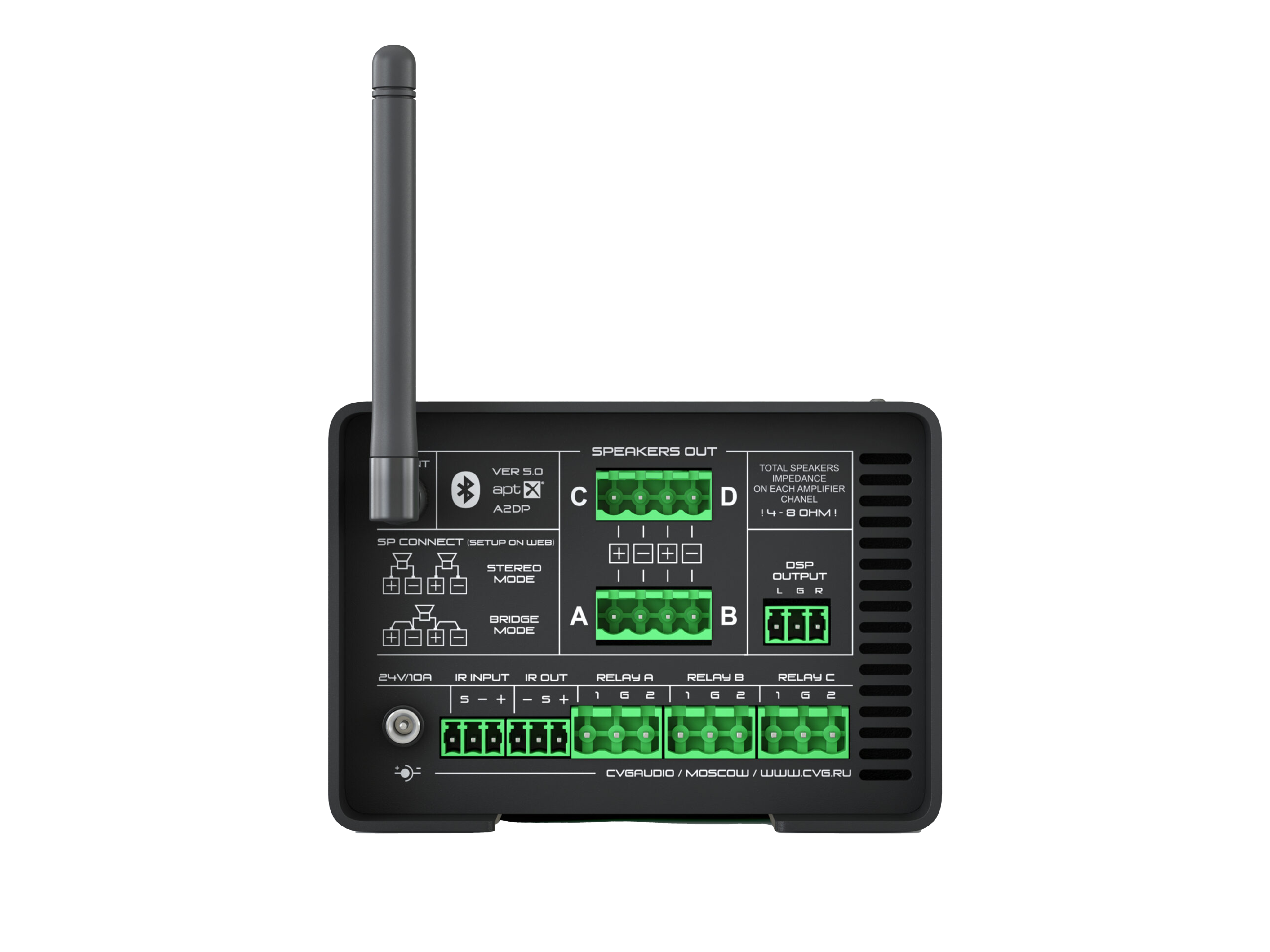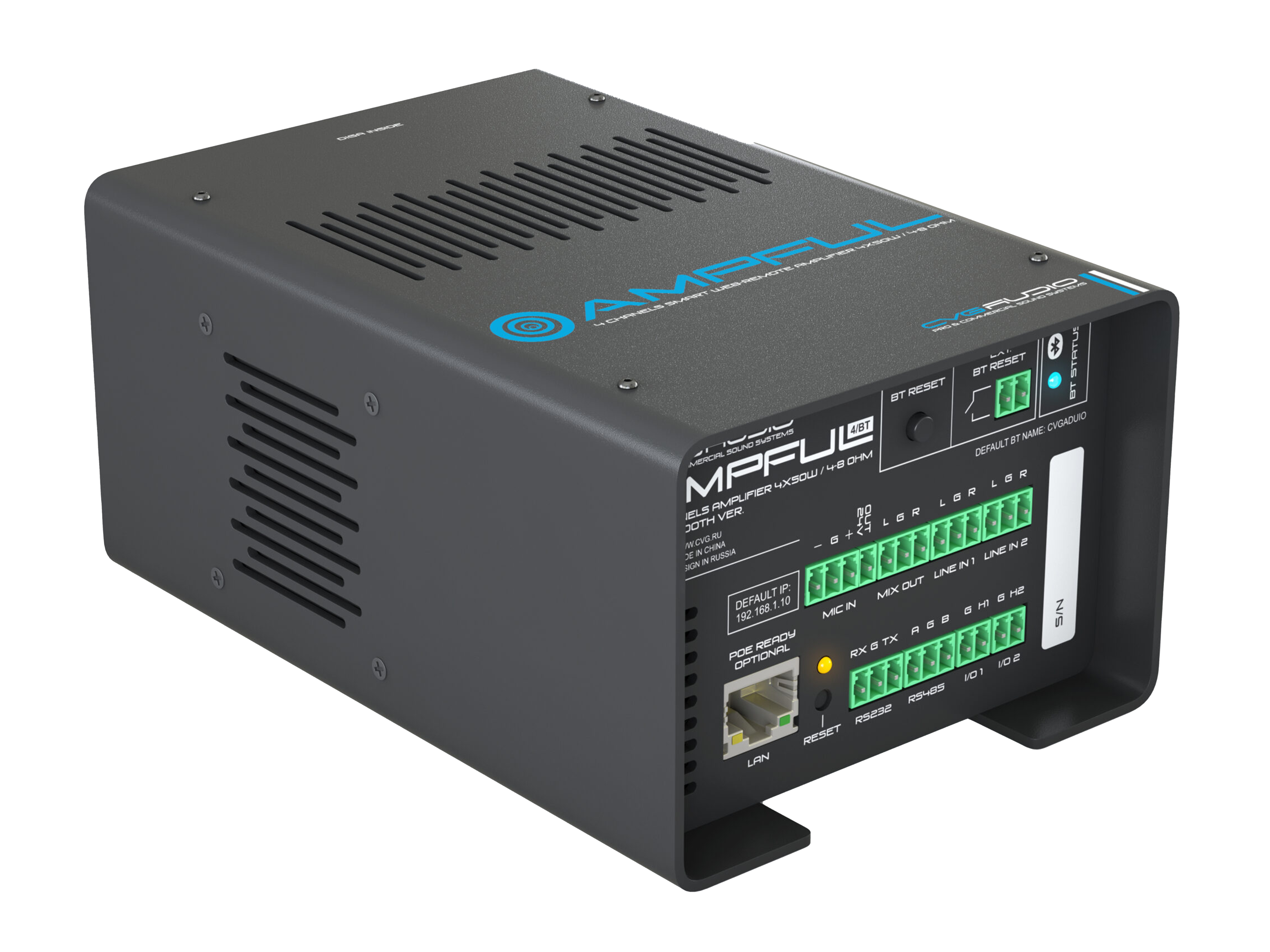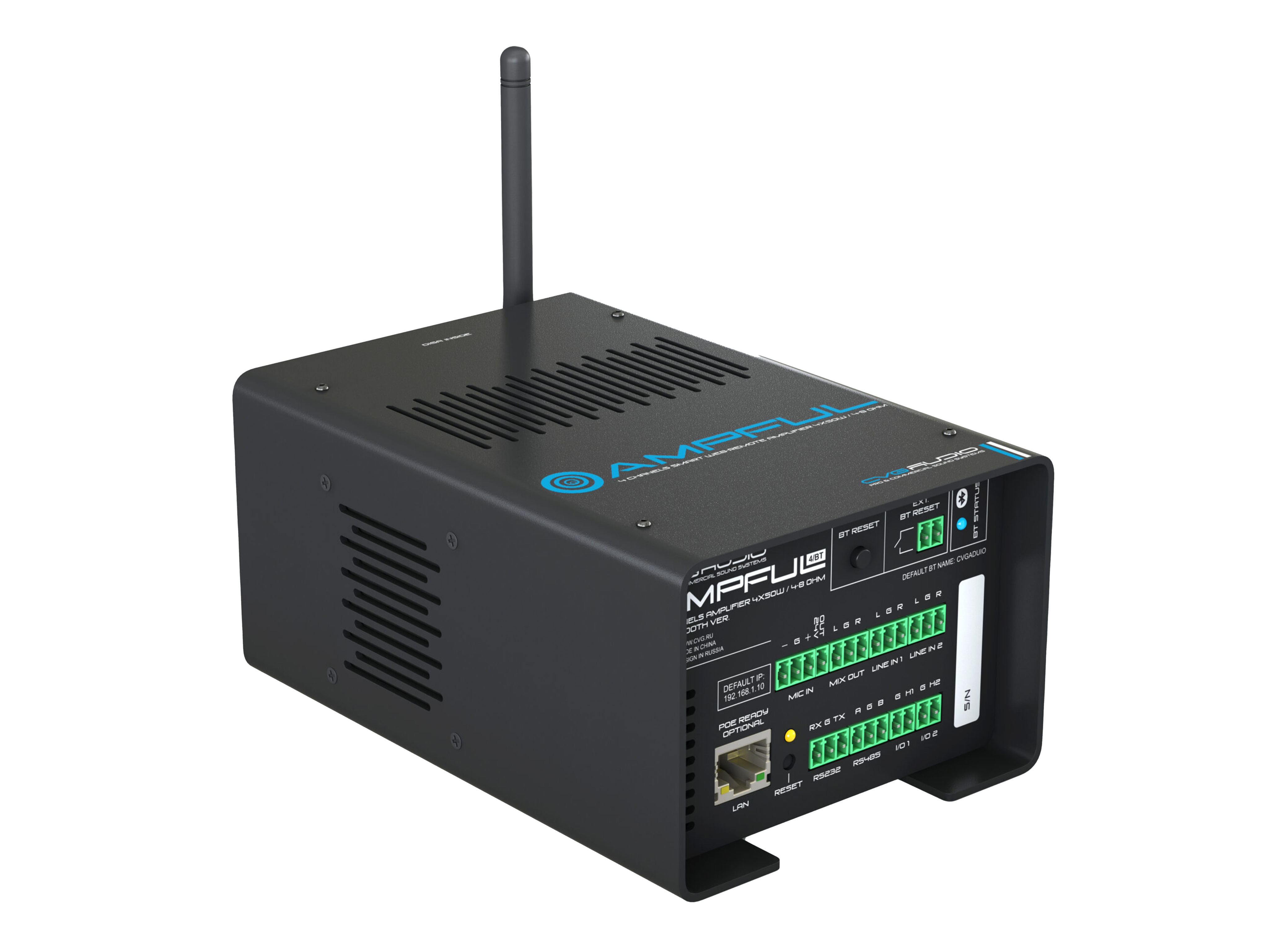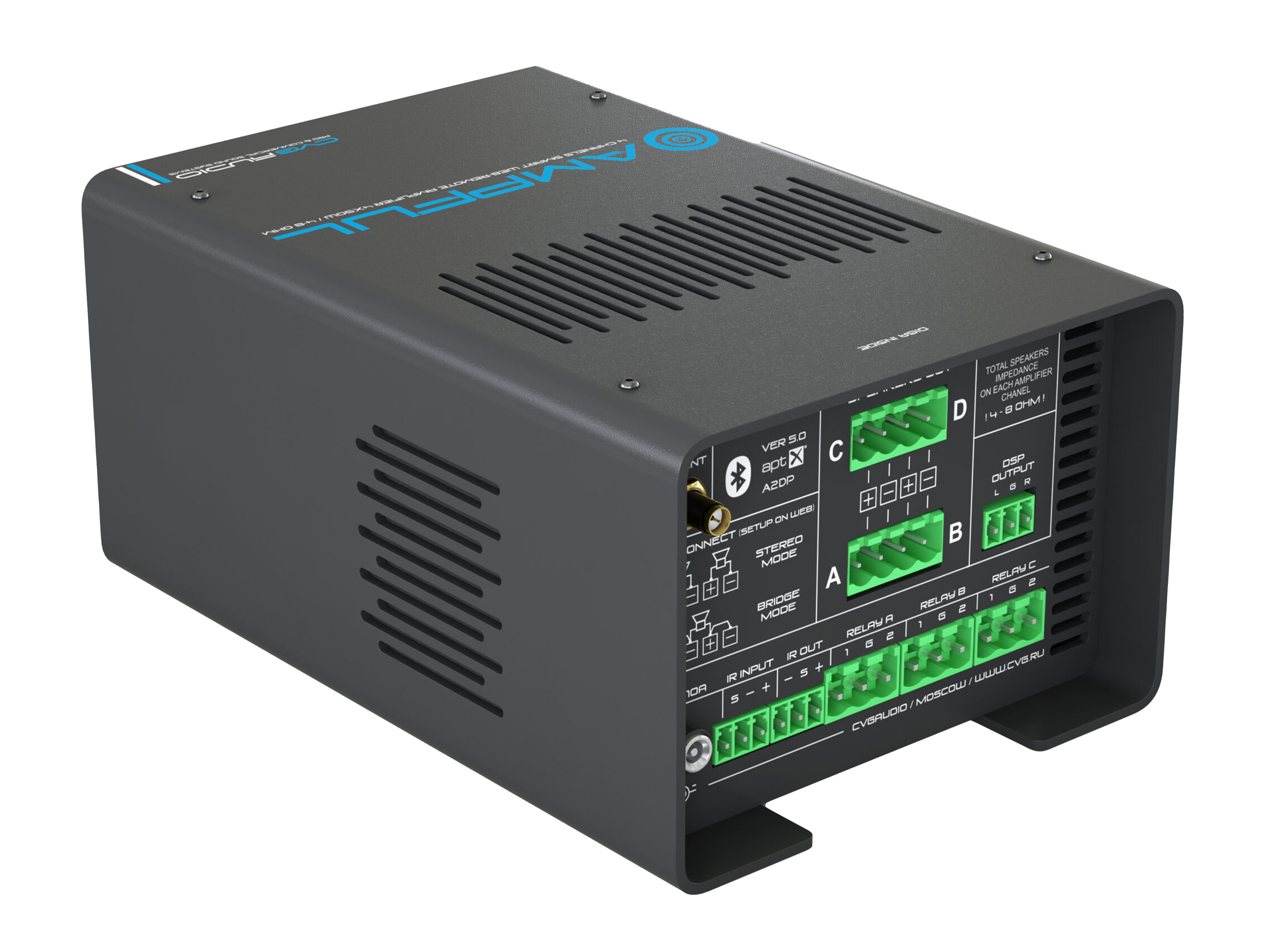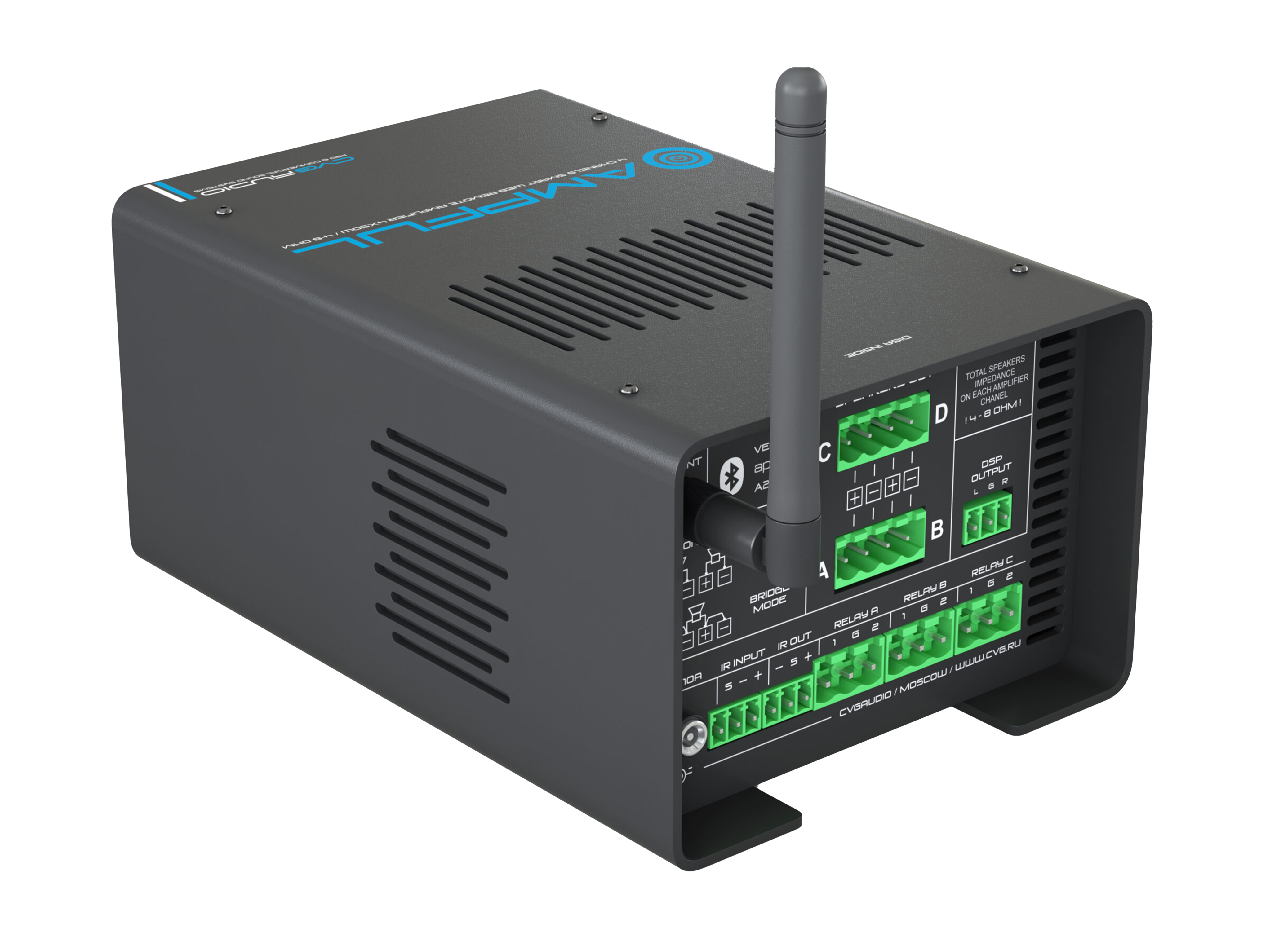 Профессиональный Low-impedance 4-х канальный усилитель с встроенным высококачественным Bluetooth V.5.0 моделем. Мощность усилителя – 4x25W(8ohn) / 4x50W(4ohm), мощность в режиме BRIDGE – 80W, D-class. Весь функционал усилителя доступен для управления с продвинутого web-интерфейса. Встроенный DSP процессор. Усилитель имеет все актуальные цифровые интерфейсы управления – TCP/IP, RS-232, RS-485, IR in/out. Может использоваться как контроллер управления мультимедиа, светом (DMX512) и смежными устройствами в рамках систем управления “умный дом” и прочих системах автоматизации начального уровня. Предусмотрен мастер создания кастомизированного пользовательского web интерфейса без использования дополнительных приложений. Три программируемых Relay, два логических I/O, недельных таймер. Блок питания в комплекте.