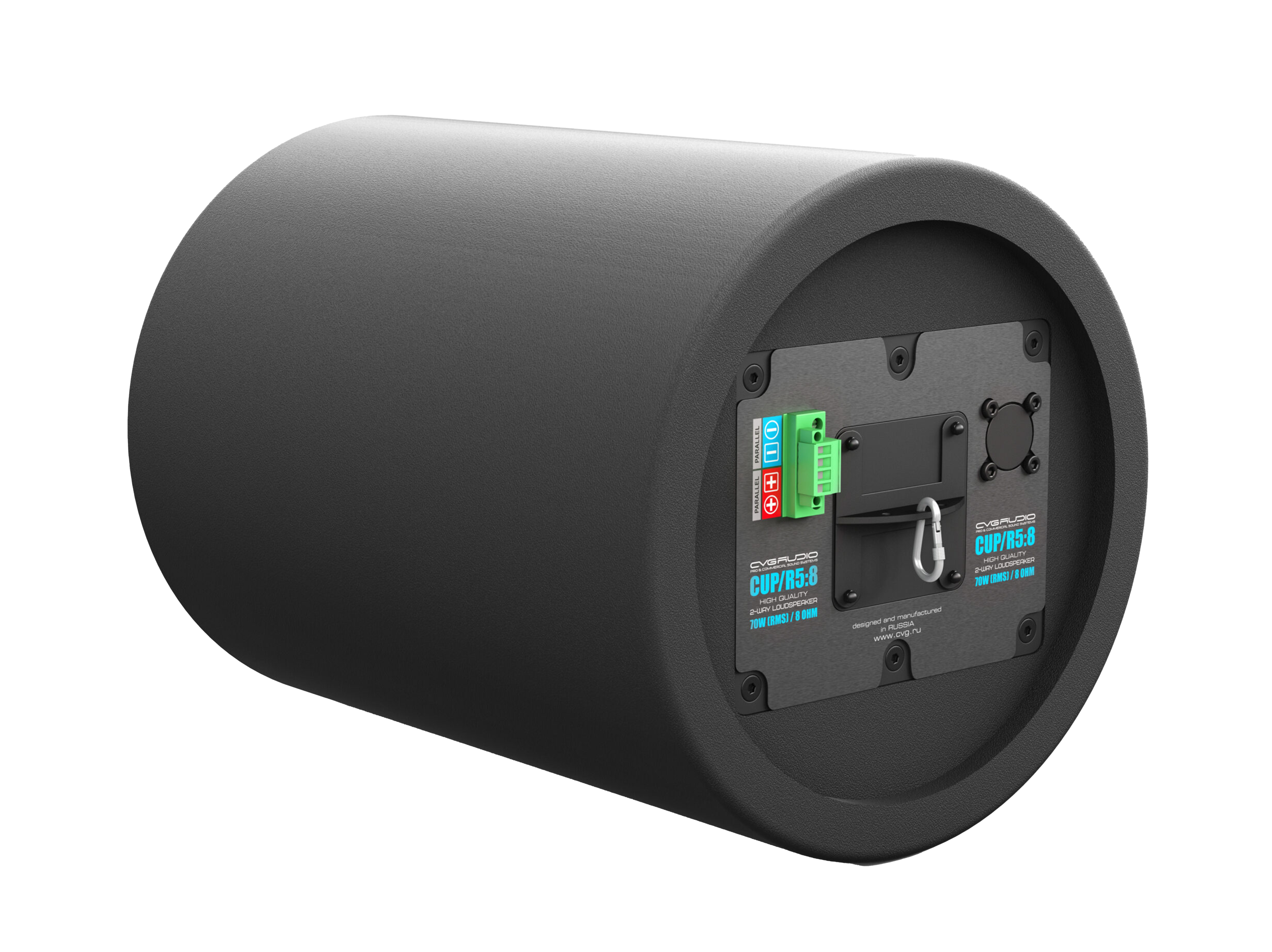 CVGAUDIO CUP5:8RBL – двухполосная подвесная акустическая система Hi-Fi класса для профессиональных звуковых инсталляций в помещениях c высокими потолками. Низкоомная (low-impedance) модель, имеет номинальный импеданс – 8ohm, мощность — 70W(RMS) / 140W(max) и предназначена для работы с низкоомными усилителями. Тип корпуса – фазоинвертор, изготовлен из высококачественного МДФ высокой плотности (МВ). Лицевая часть, на которой находятся излучатели и порт фазоинвертора скрыта круглой стальной сеткой, окрашенной в цвет корпуса. Акустические системы CVGAUDIO CUP5:8RBL разработаны и производятся в России.