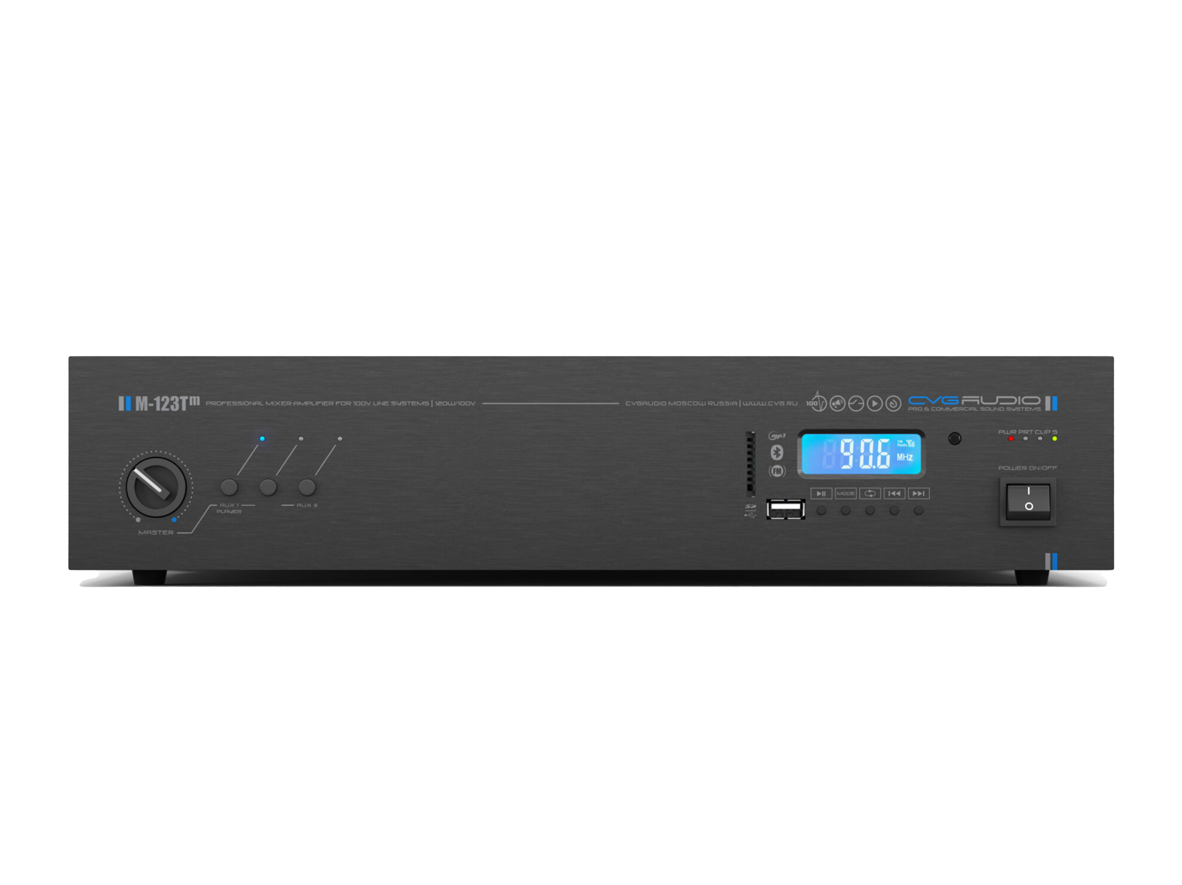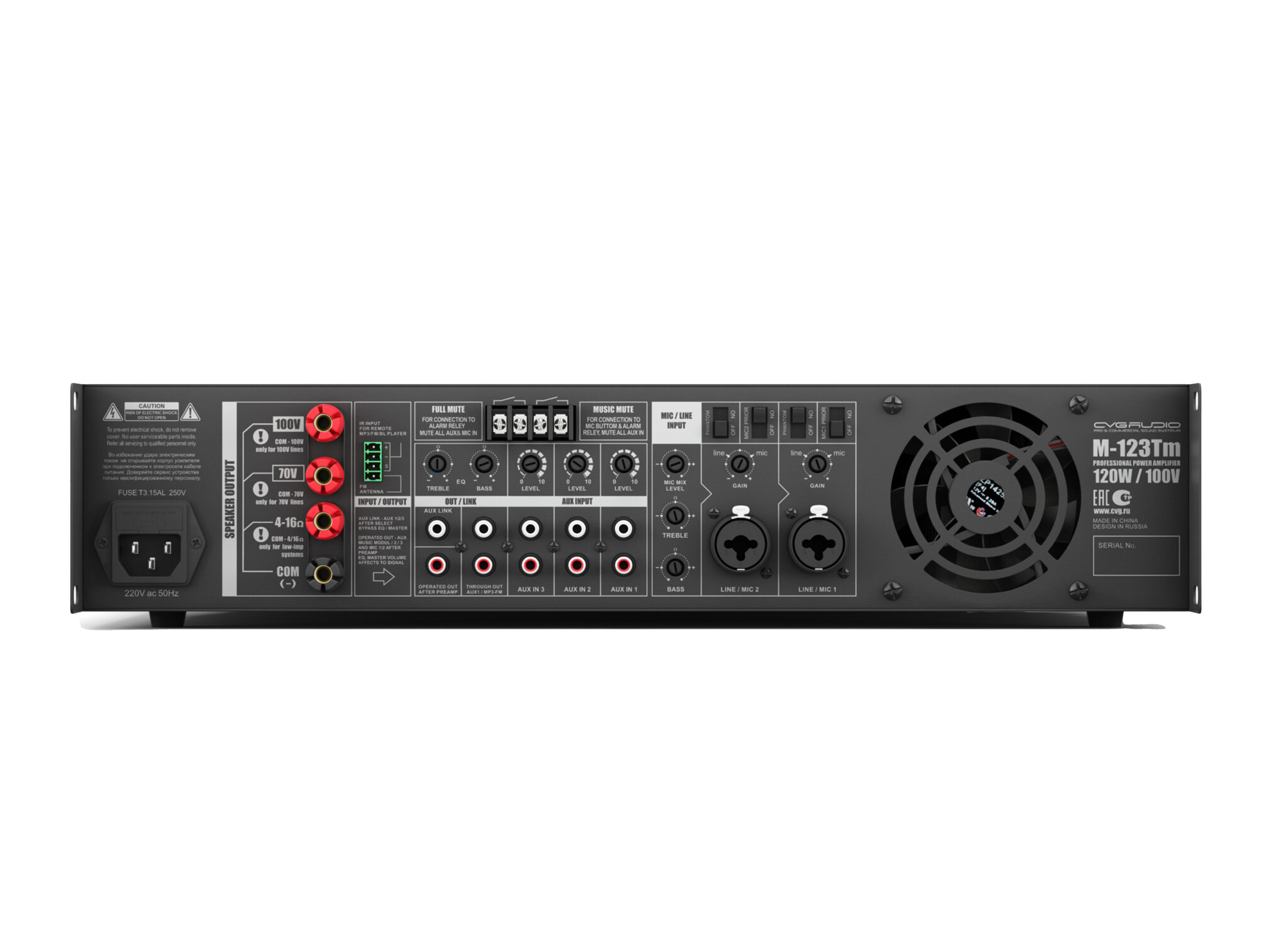Профессиональный микшер-усилитель, встроенный модуль источника сигнала (MP3 — USB/SDcard, FM тюнер, Bluetooth). Предназначен для качественных систем трансляции фоновой музыки и голосового оповещения, мощность 120W/100V, 3 line in (3x2RCA), 2 mic/line in (XLR/TRS), настраиваемый приоритет, фантомное питание 24V, управляющие контакты FULL MUTE, MUSIC MUTE, раздельный двухполосный EQ для линейных и микрофонных входов, индивидуальная настройка чувствительности для каждого входа, сквозной выход THROUGH OUT (2RCA) c входа LINE1 / MP3-FM модуль, линейный выход AUX LINK (RCA), управляемый выход OPERATED OUT (RCA), корпус 2U.