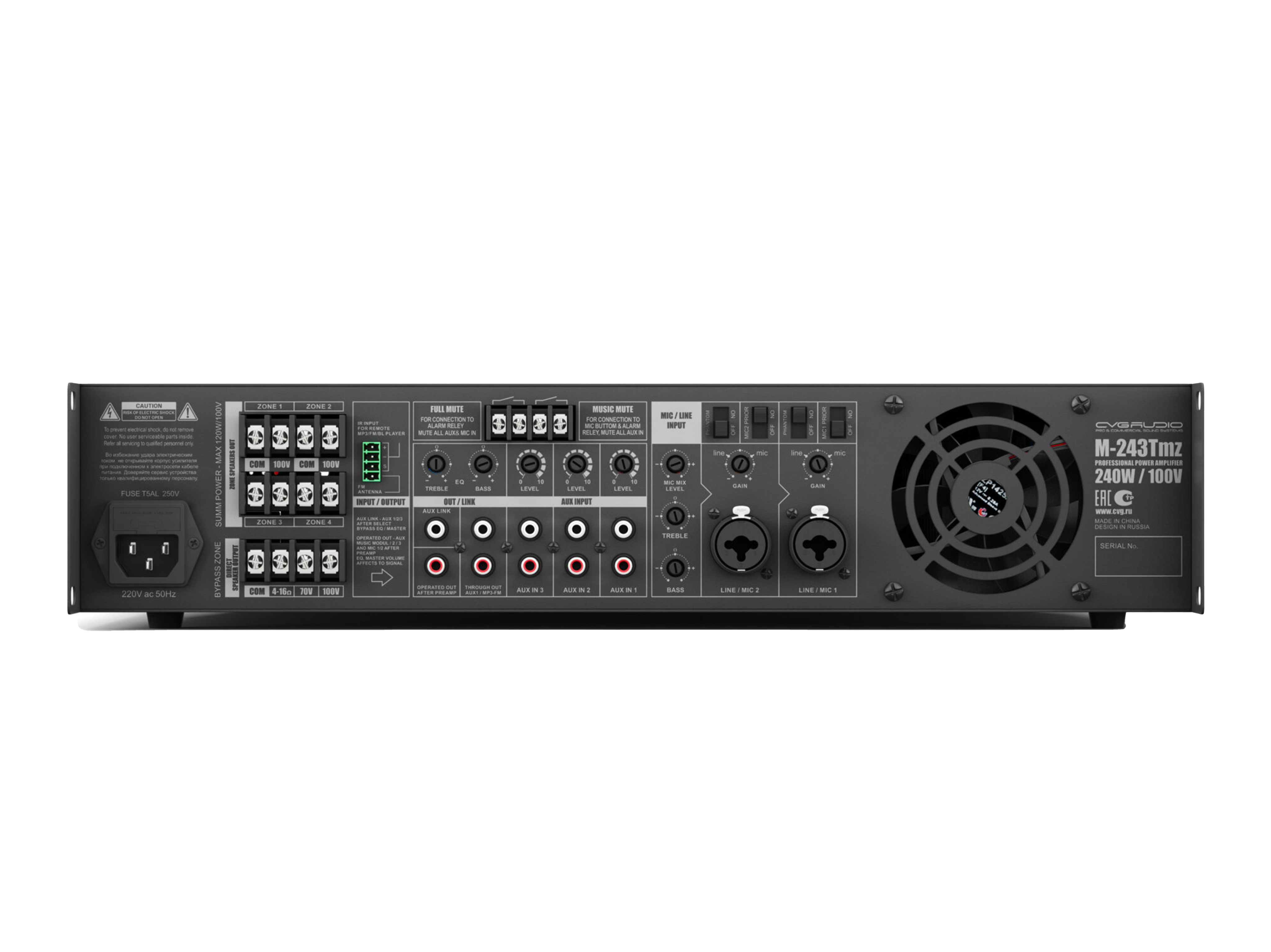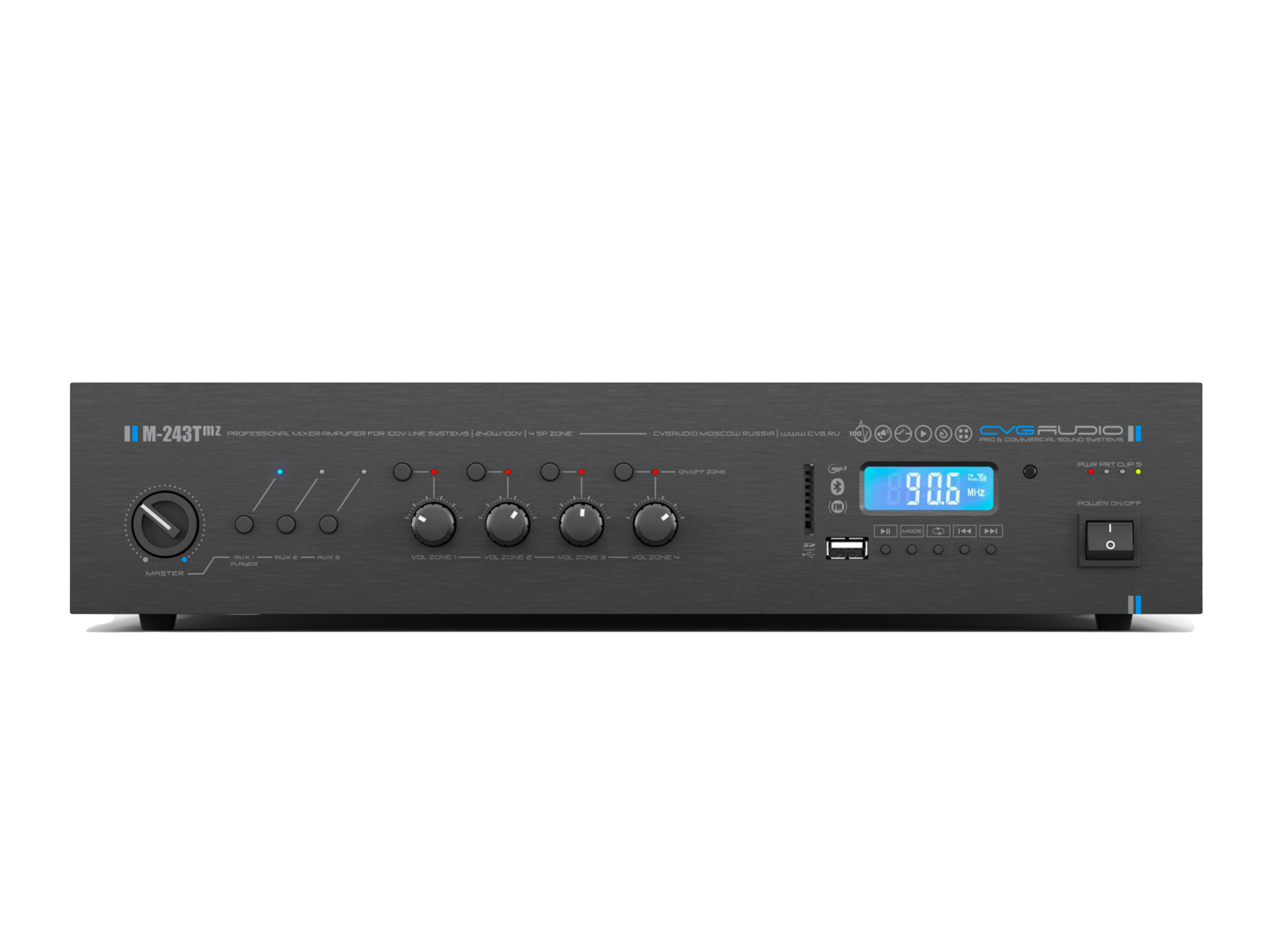 Профессиональный микшер-усилитель, встроенный модуль источника сигнала (MP3 — USB/SDcard, FM тюнер, Bluetooth), 4 управляемые спикерные зоны. Предназначен для качественных систем трансляции фоновой музыки и голосового оповещения, мощность 240W/100V, 3 line in (3x2RCA), 2 mic/line in (XLR/TRS), настраиваемый приоритет, фантомное питание 24V, управляющие контакты FULL MUTE, MUSIC MUTE, раздельный двухполосный EQ для линейных и микрофонных входов, индивидуальная настройка чувствительности для каждого входа, сквозной выход THROUGH OUT (2RCA) c входа LINE1 / MP3-FM модуль, линейный выход AUX LINK (RCA), управляемый выход OPERATED OUT (RCA), корпус 2U.
