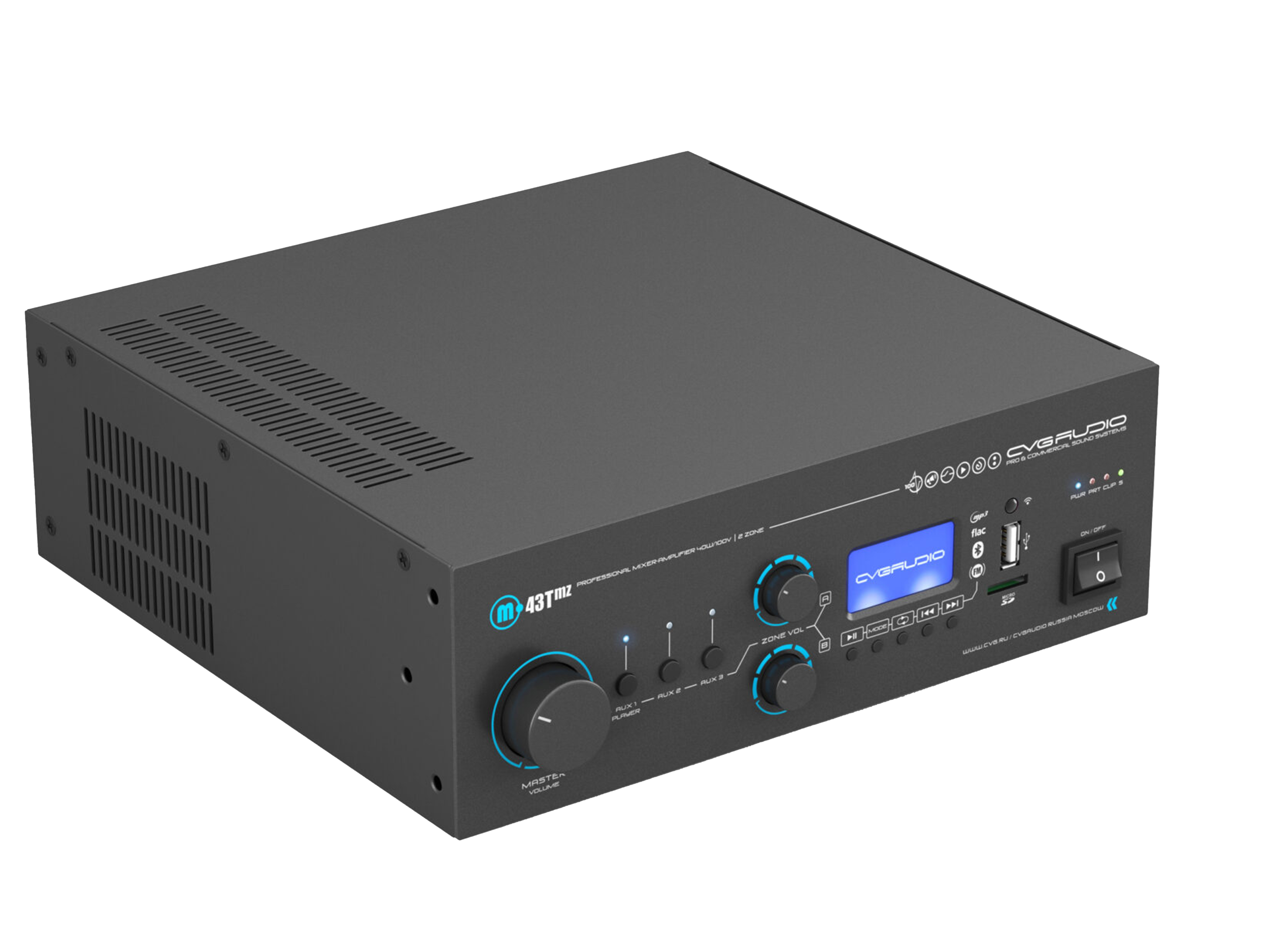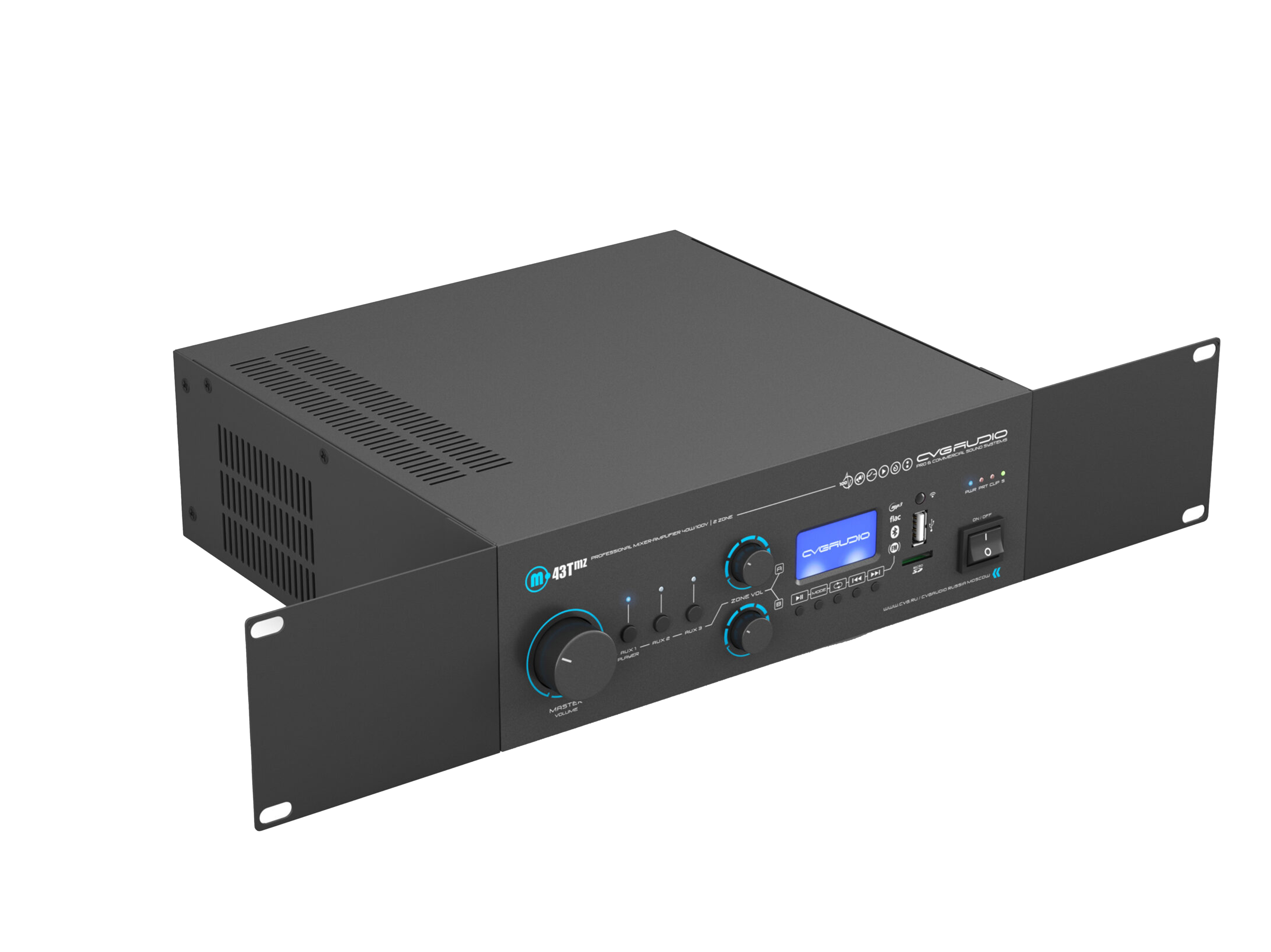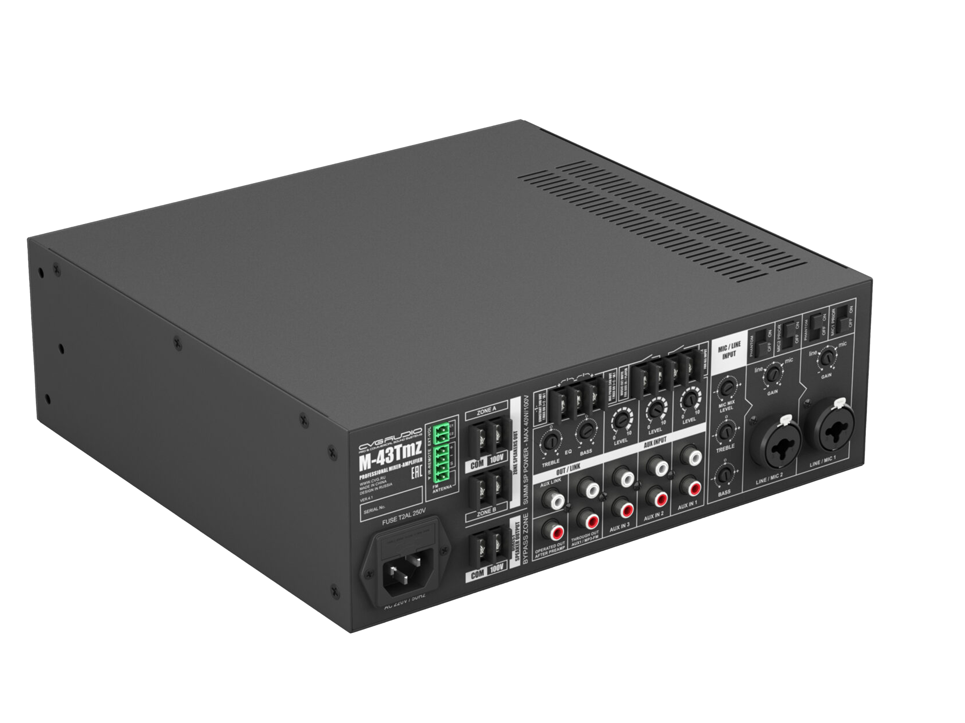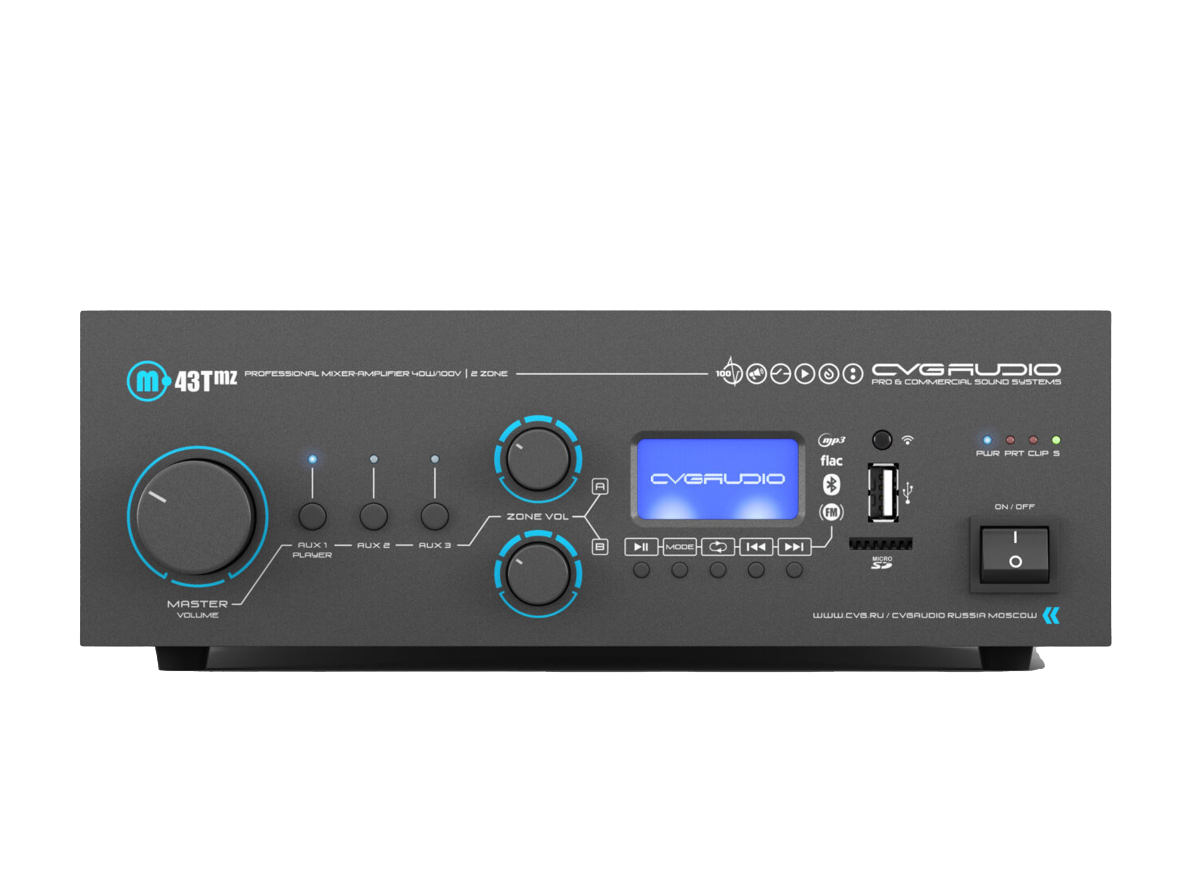 Профессиональный многофункциональный микшер-усилитель с двумя управляемыми спикерными зонами. Только для работы со 100V трансляционными акустическими системами. Мощность – 40W/100V. Встроенный источник сигнала – USB/MicroSD плеер, BLUETOOTH ресивер, FM тюнер. Три селективных линейных входа (2RCA), два балансных микрофонных входа (TRS/XLR) с возможность подачи фантомного питания и управляемым приоритетом. Контакты EXT.MUTE для интеграции в системы аварийно-пожарного оповещения. Питание 24V OUT для внешних панелей и источников сигнала, 24V OUT активируемый при работе приоритетного микрофона, возможность подключения внешнего регулятора громкости CVGAUDIO NVC. Уменьшенный корпус, установка в монтажную стойку с помощью опциональных кронштейнов CVGAUDIO MR/S.
