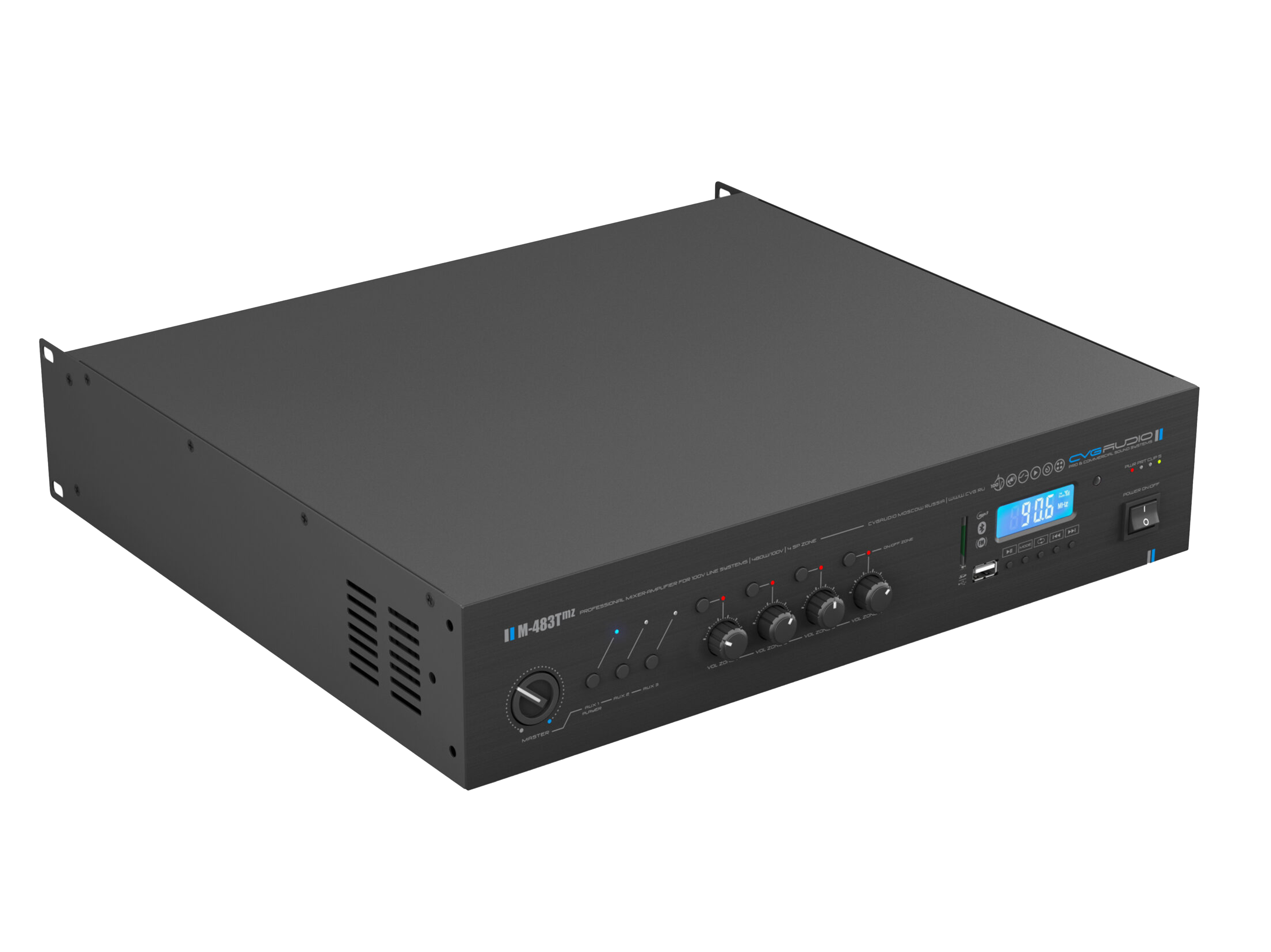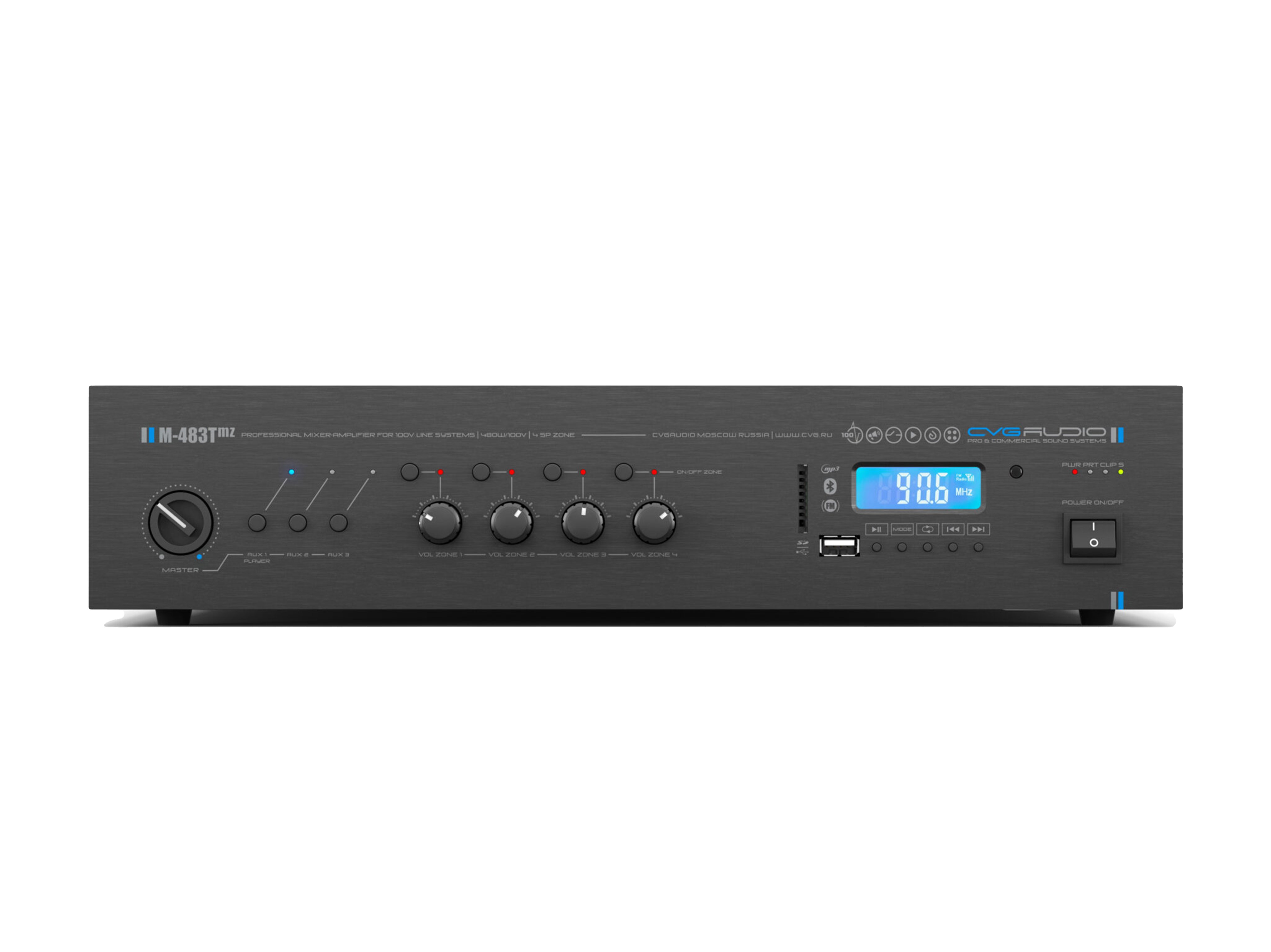 Профессиональный микшер-усилитель, встроенный модуль источника сигнала (MP3 — USB/SDcard, FM тюнер, Bluetooth), 4 управляемые спикерные зоны. Предназначен для качественных систем трансляции фоновой музыки и голосового оповещения. Мощность 480W/100V, 3 line in (3x2RCA), 2 mic/line in (XLR/TRS), настраиваемый приоритет, фантомное питание 24V, управляющие контакты FULL MUTE, MUSIC MUTE, раздельный двухполосный EQ для линейных и микрофонных входов, индивидуальная настройка чувствительности для каждого входа, сквозной выход THROUGH OUT (2RCA) c входа LINE1 / MP3-FM модуля, линейный выход AUX LINK (RCA) с выбранного на входном селекторе AUN IN, управляемый выход OPERATED OUT (RCA) после предусилителя. IR вход для управления встроенным модулем плеера с внешних устройств серии DIGA. Корпус 2U, крепление в монтажную стойку в комплекте.