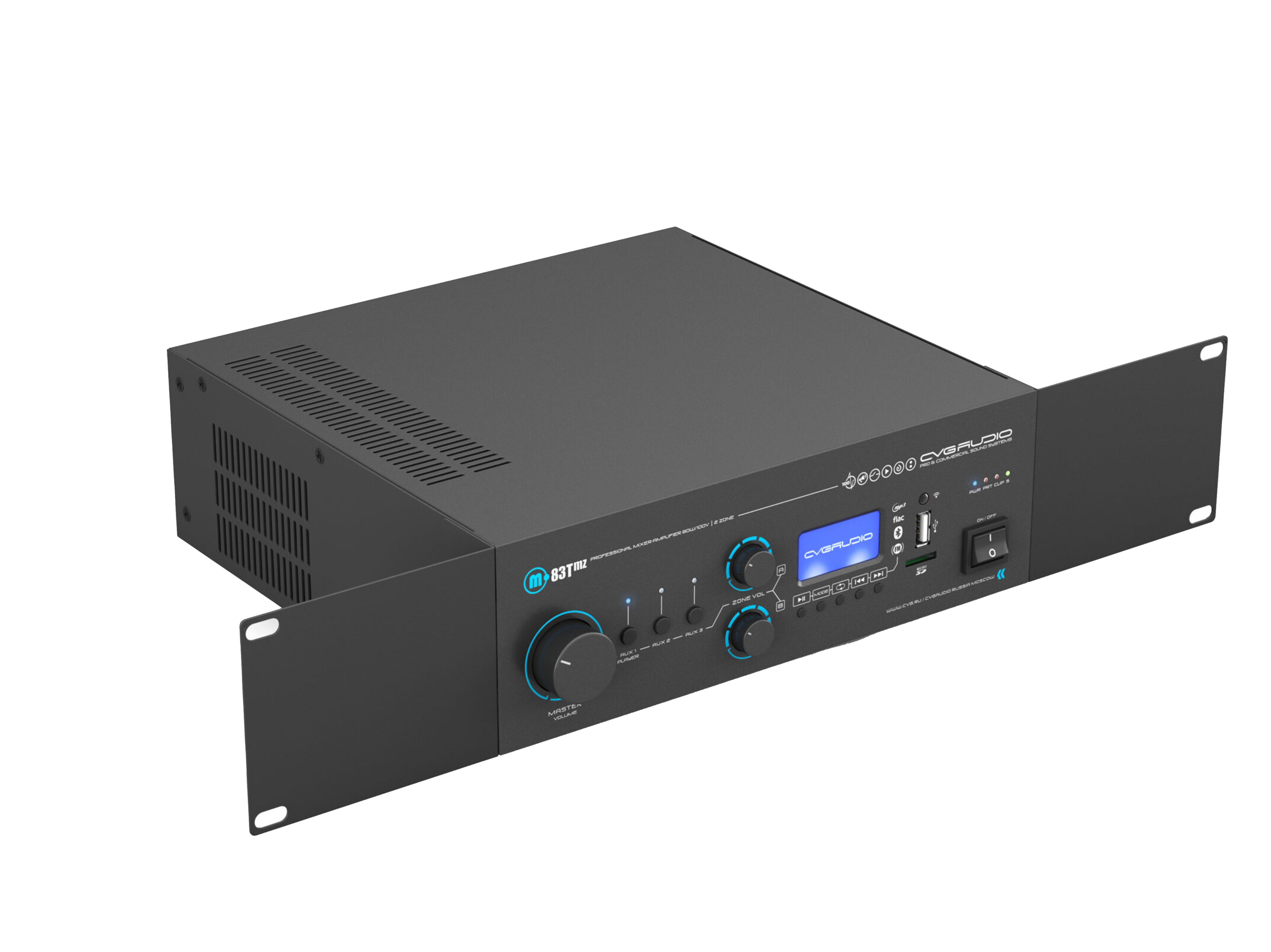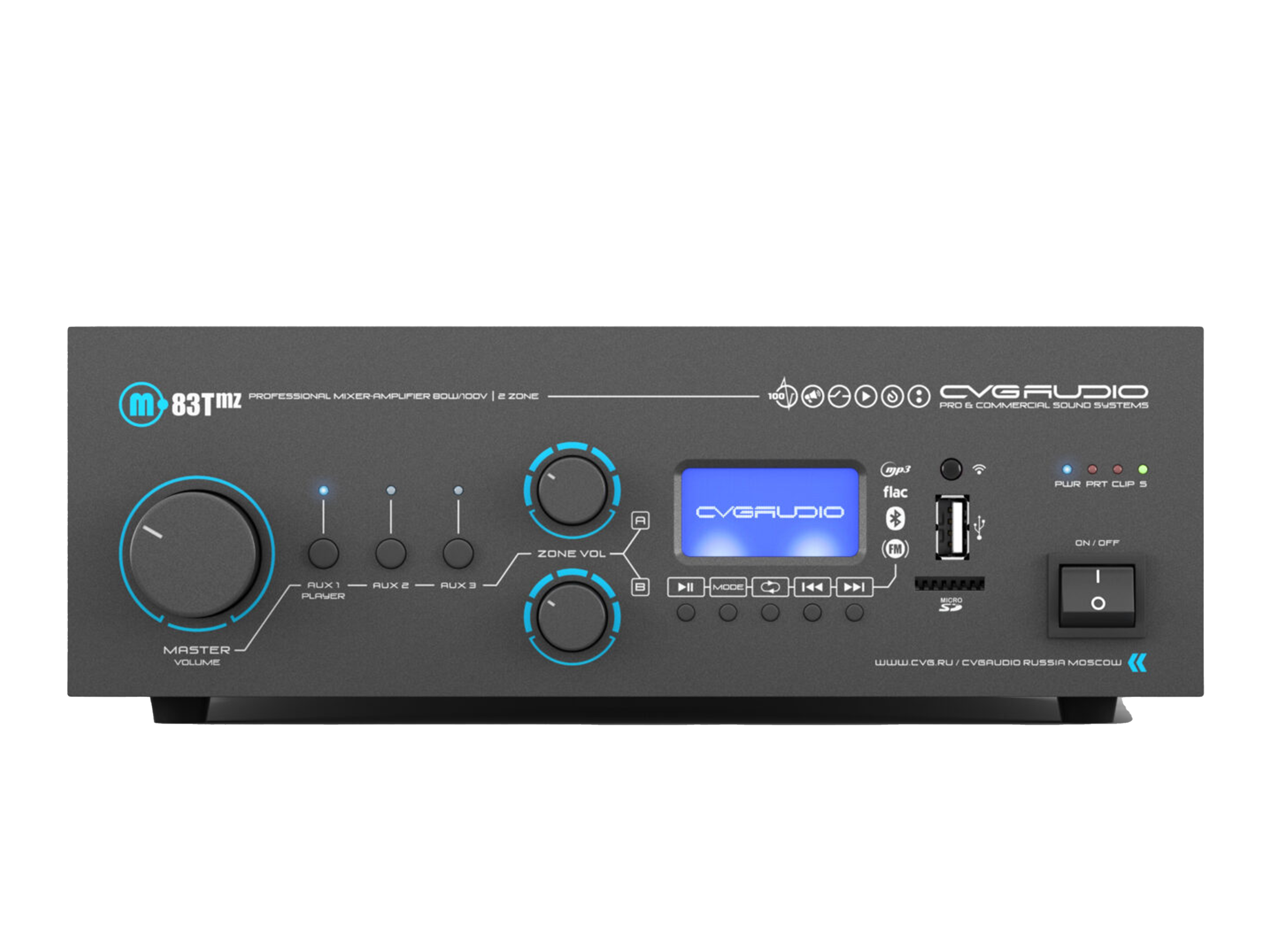Профессиональный многофункциональный микшер-усилитель с двумя управляемыми спикерными зонами. Только для работы со 100V трансляционными акустическими системами. Мощность – 80W/100V. Встроенный источник сигнала – USB/MicroSD плеер, BLUETOOTH ресивер, FM тюнер. Три селективных линейных входа (2RCA), два балансных микрофонных входа (TRS/XLR) с возможность подачи фантомного питания и управляемым приоритетом. Контакты EXT.MUTE для интеграции в системы аварийно-пожарного оповещения. Питание 24V OUT для внешних панелей и источников сигнала, 24V OUT активируемый при работе приоритетного микрофона, возможность подключения внешнего регулятора громкости CVGAUDIO NVC. Уменьшенный корпус, установка в монтажную стойку с помощью опциональных кронштейнов CVGAUDIO MR/S.