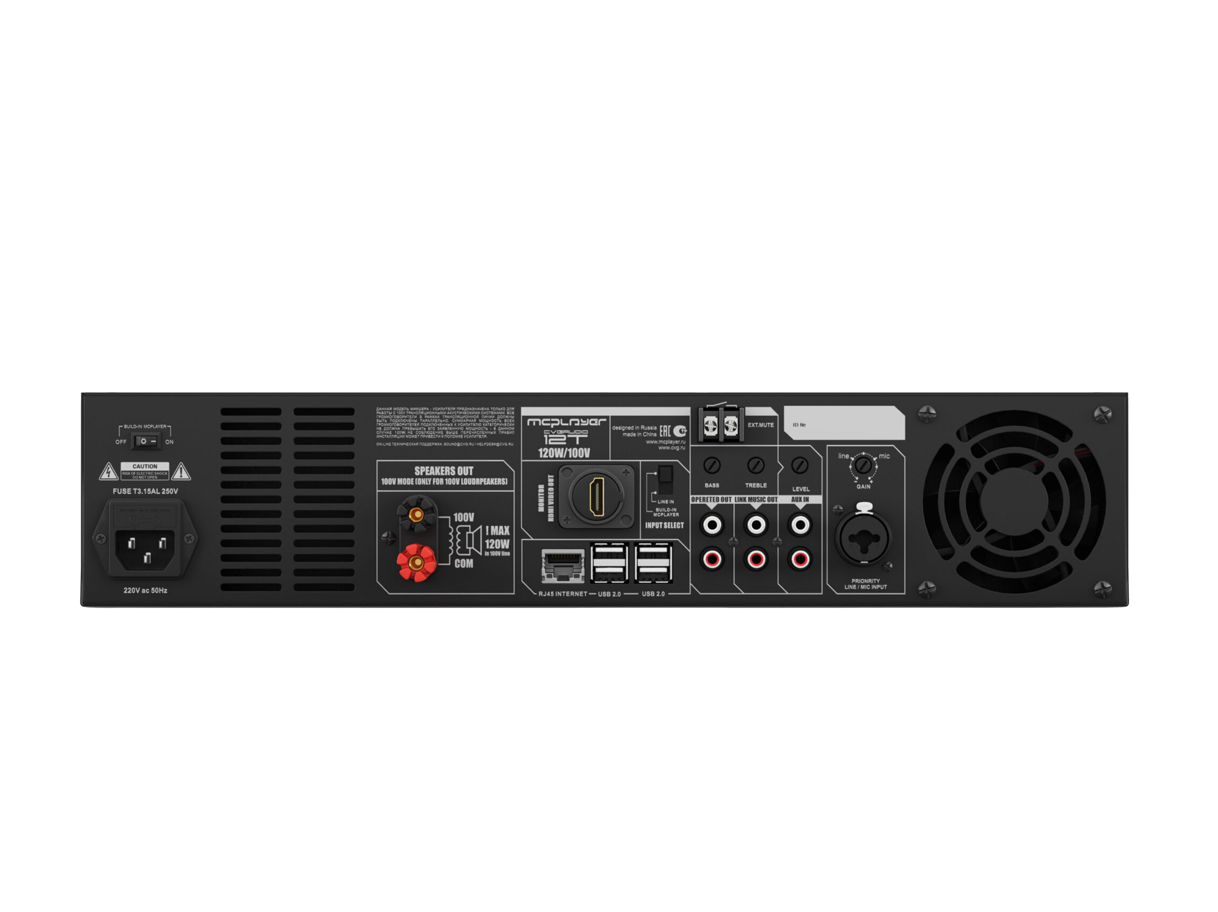 Профессиональный микшер-усилитель 120W/100V, два селективных LINE IN (INNER — встроенный плеер и OUTER — внешний источник). Интегрированный микрокомпьютер Raspberry Pi 3B для работы с профессиональными сетевыми сервисами, предоставляющими лицензированный контент. Универсальный LINE/MIC вход с управляемой чувствительностью, фантомным питанием и приоритетом над линейными входами. Управляющие контакты EXT.MUTE для интеграции с СОУЭ. Функция BYPASS LOCK для блокировки управления с лицевой панели усилителя. Корпус – 2U, кронштейны в стандартном комплекте поставки.