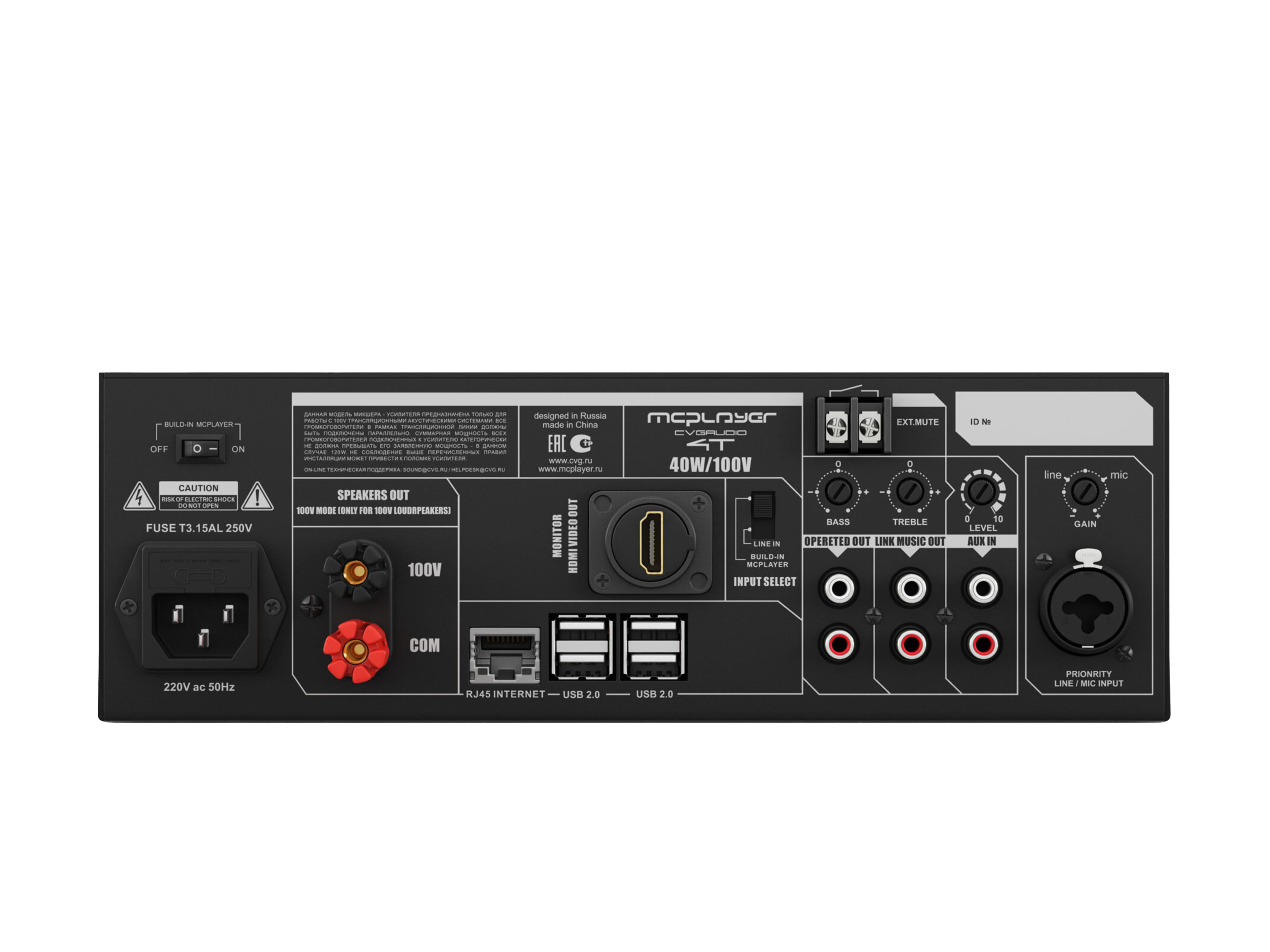 Профессиональный микшер-усилитель 40W/100V, два селективных LINE IN (INNER — встроенный плеер и OUTER — внешний источник). Интегрированный микрокомпьютер Raspberry Pi 3B для работы с профессиональными сетевыми сервисами, предоставляющими лицензированный контент. Универсальный LINE/MIC вход с управляемой чувствительностью, фантомным питанием и приоритетом над линейными входами. Управляющие контакты EXT.MUTE для интеграции с СОУЭ. Функция BYPASS LOCK для блокировки управления с лицевой панели усилителя. Корпус – 2U, кронштейны в стандартном комплекте поставки.