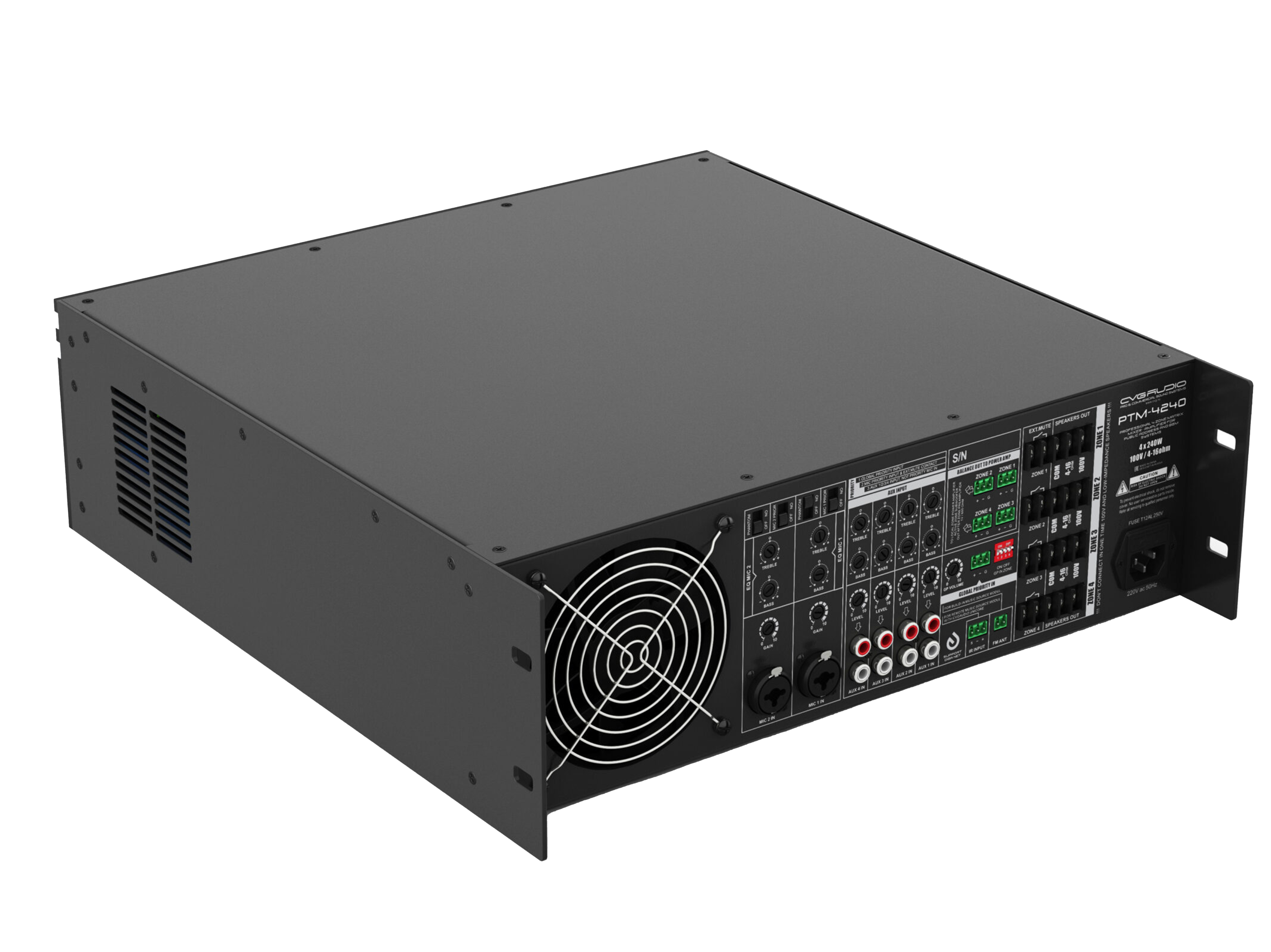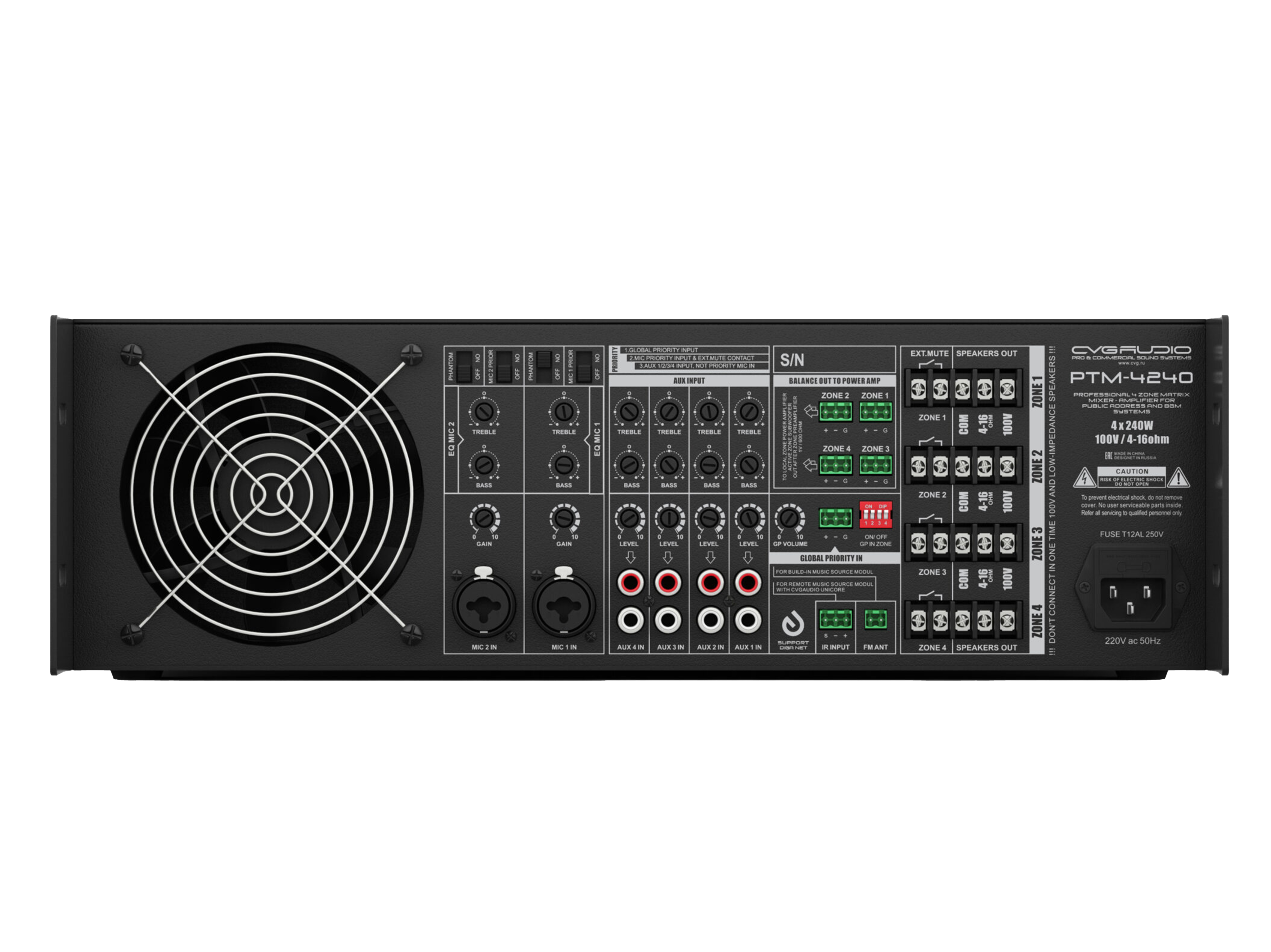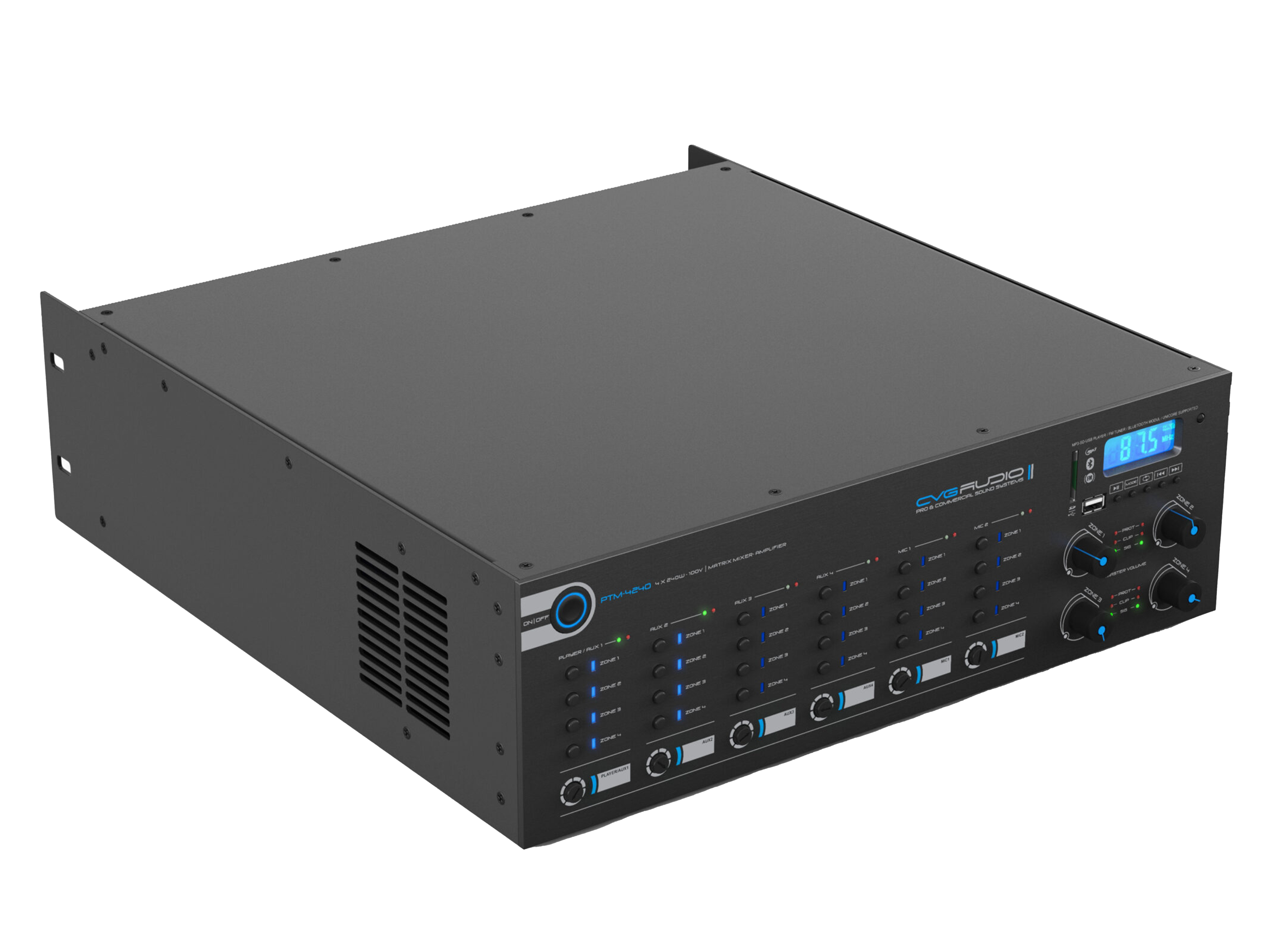 Профессиональный матричный 4-х зонный микшер-усилитель, 4x240W/100V или 4-16ohm, 4хLINE IN (2RCA), 2хMIC IN (TRS/XLR) с фантомным питанием и настраиваемым приоритетом, встроенный модуль источника сигнала — MP3 player (USB/SDcard), FM-tuner, Bluetooth. Индивидуальный 2-х полосный EQ для каждого входа. Контакты EXT.MUTE раздельно для каждой зоны, аварийный вход Global Priority. IR input для управления плеером с систем управления DIGA series. Корпус 3U, кронштейны в комплекте.