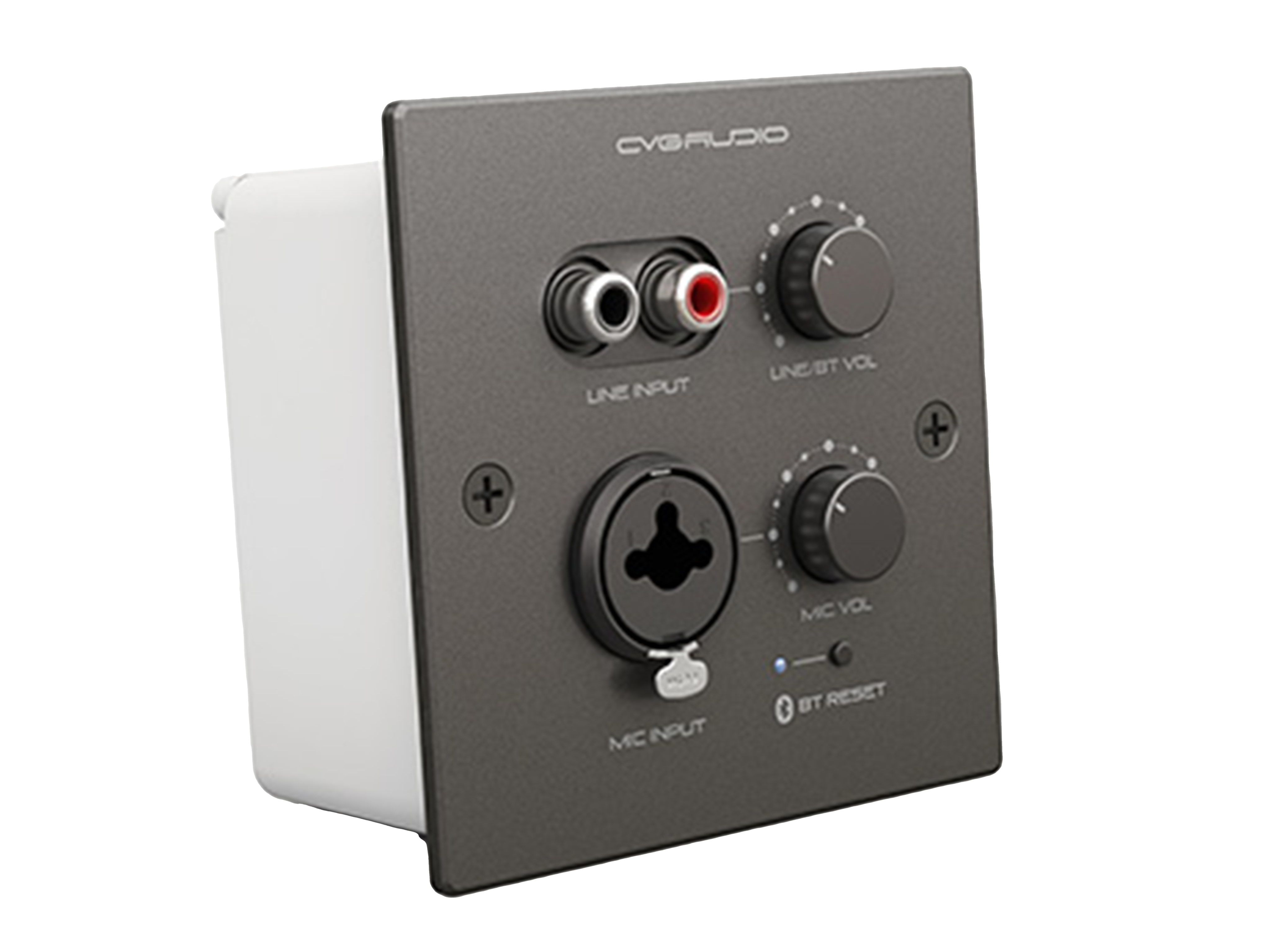 Настенная панель удаленного зонального подключения, MIC IN – XLR c фантомным питанием, LINE IN — 2RCA, Bluetooth с внутренней антенной-стикером. Раздельная регулировка громкости Line In плюс Blutooth и MIC IN. Питание 12V-24V. Совместим с процессорами семейства ZONER. Максимальное удаление при подключении по CAT5/6 – 100 метров. Выход – балансный моно / балансный стерео суммарный аудио сигнал. Bluetooth имеет возможность тонкой настройки, изменения названия сети, пин-кода на соединение и так далее. Радиус уверенного приема – 15m. Совместим с контроллерами CVGAUDIO ERC. Лицевая панель – темный алюминий.