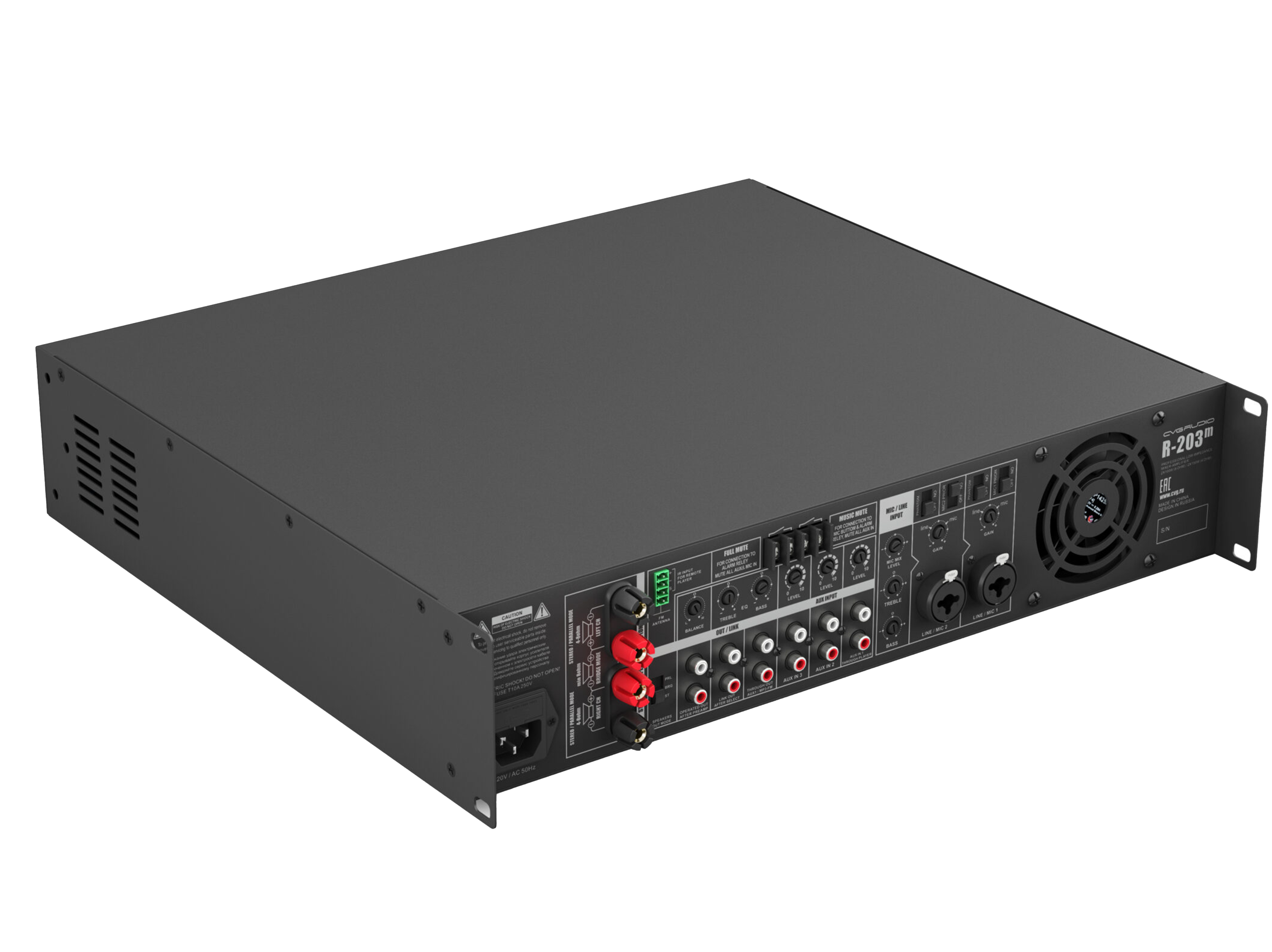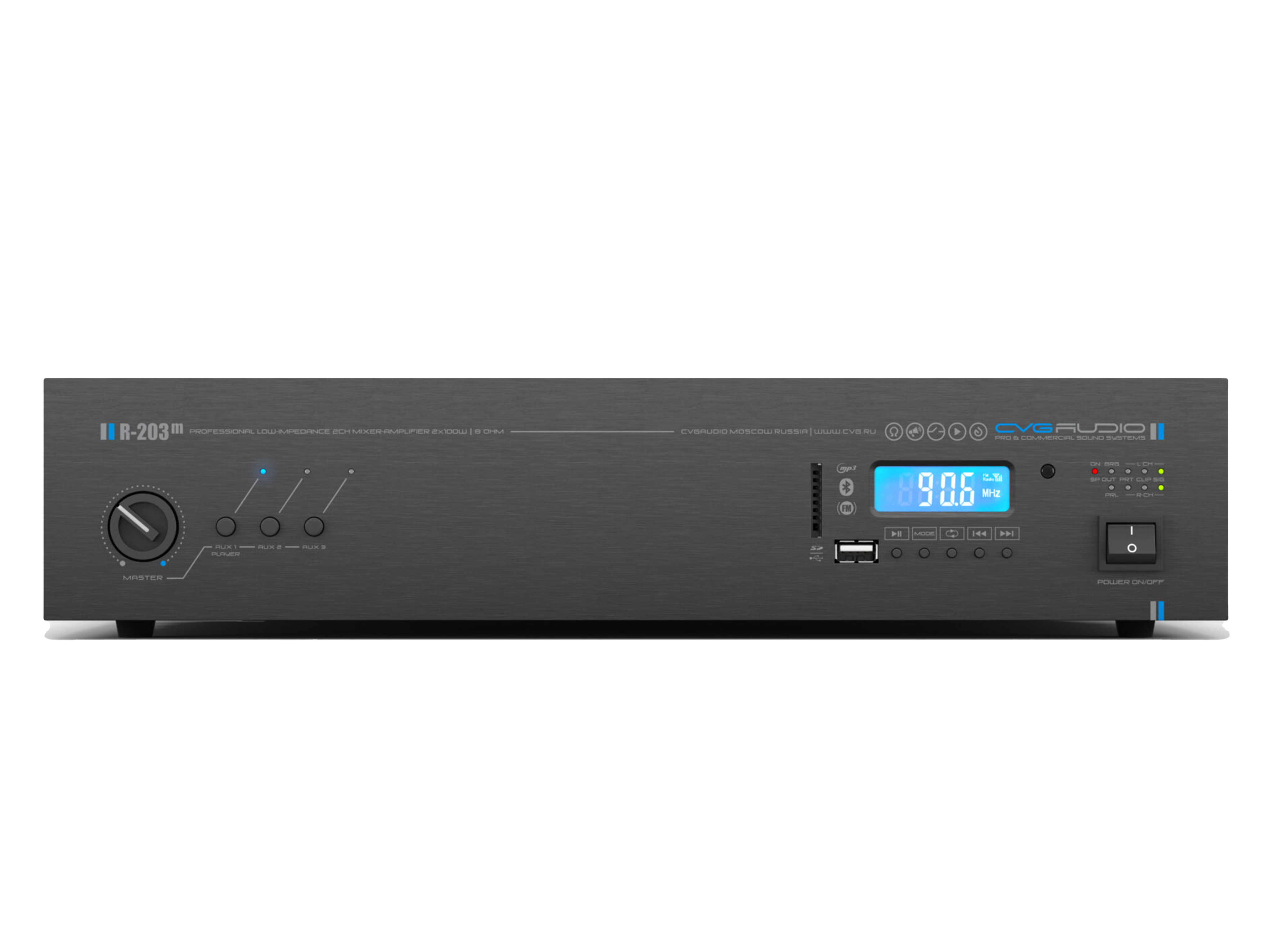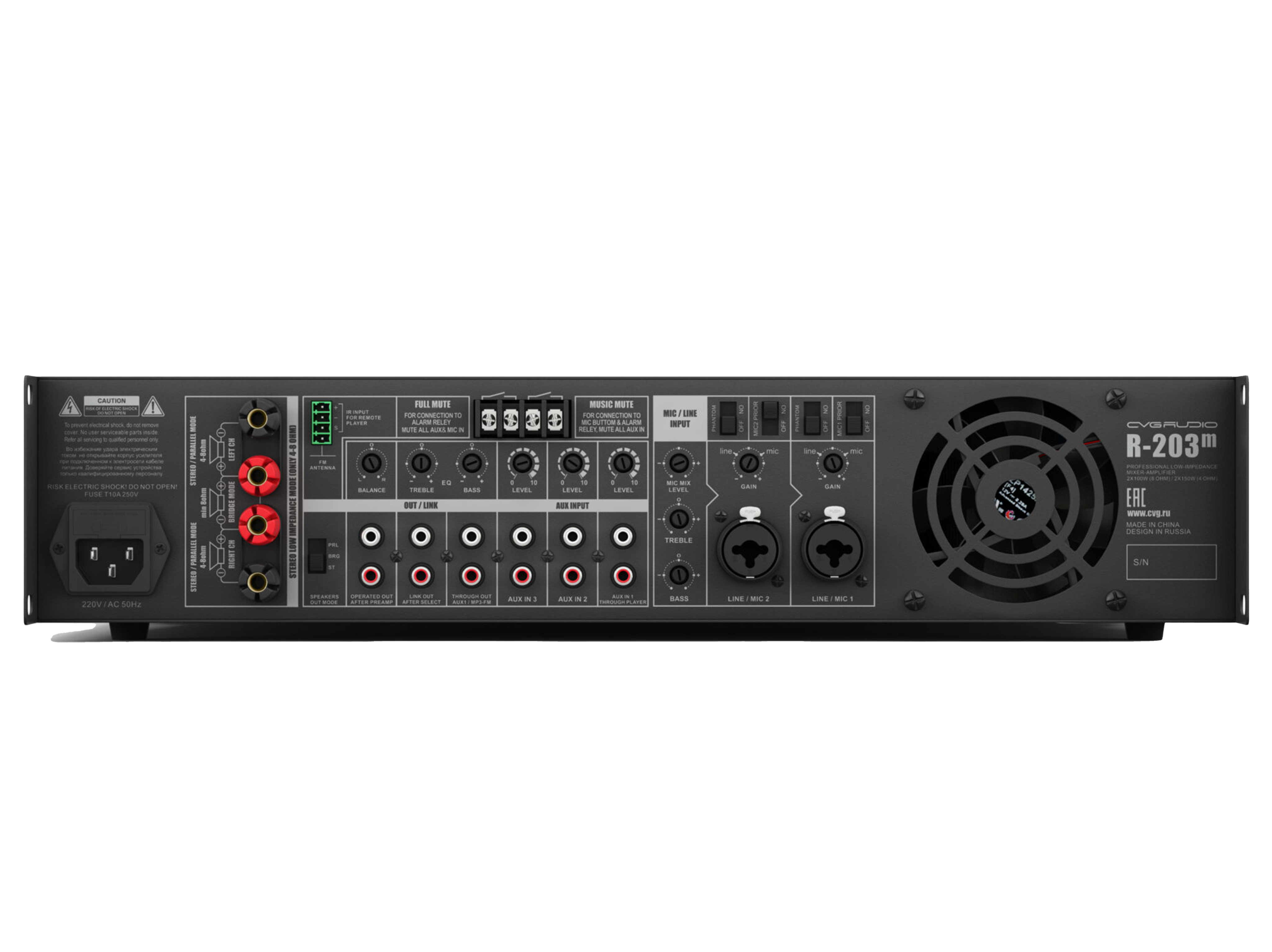 Профессиональный 2-х канальный стереофонический усилитель, 2x100W/8ohm, 2x150W/4ohm, допустимое сопротивление нагрузки 4-8ohm, 3 Line input – 3x2RCA с селектором выбора активного входа, встроенный USB/SD плеер, FM тюнер, Bluetooth, два mic input 2xTRS/XLR с возможностью активации приоритета над другими входами и включения фантомного питания, EQ раздельно для line и mic входов, EXT.MUTE/FULL MUTE контакты, режимы stereo/bridge/parallel. Металлический корпус – 2U (крепеж в стойку в комплекте). Активное охлаждение с зависимостью скорости вращения вентилятора от температуры нагрева радиатора. Защита от короткого замыкания, перегрева, перегрузки, предохранитель по питанию.