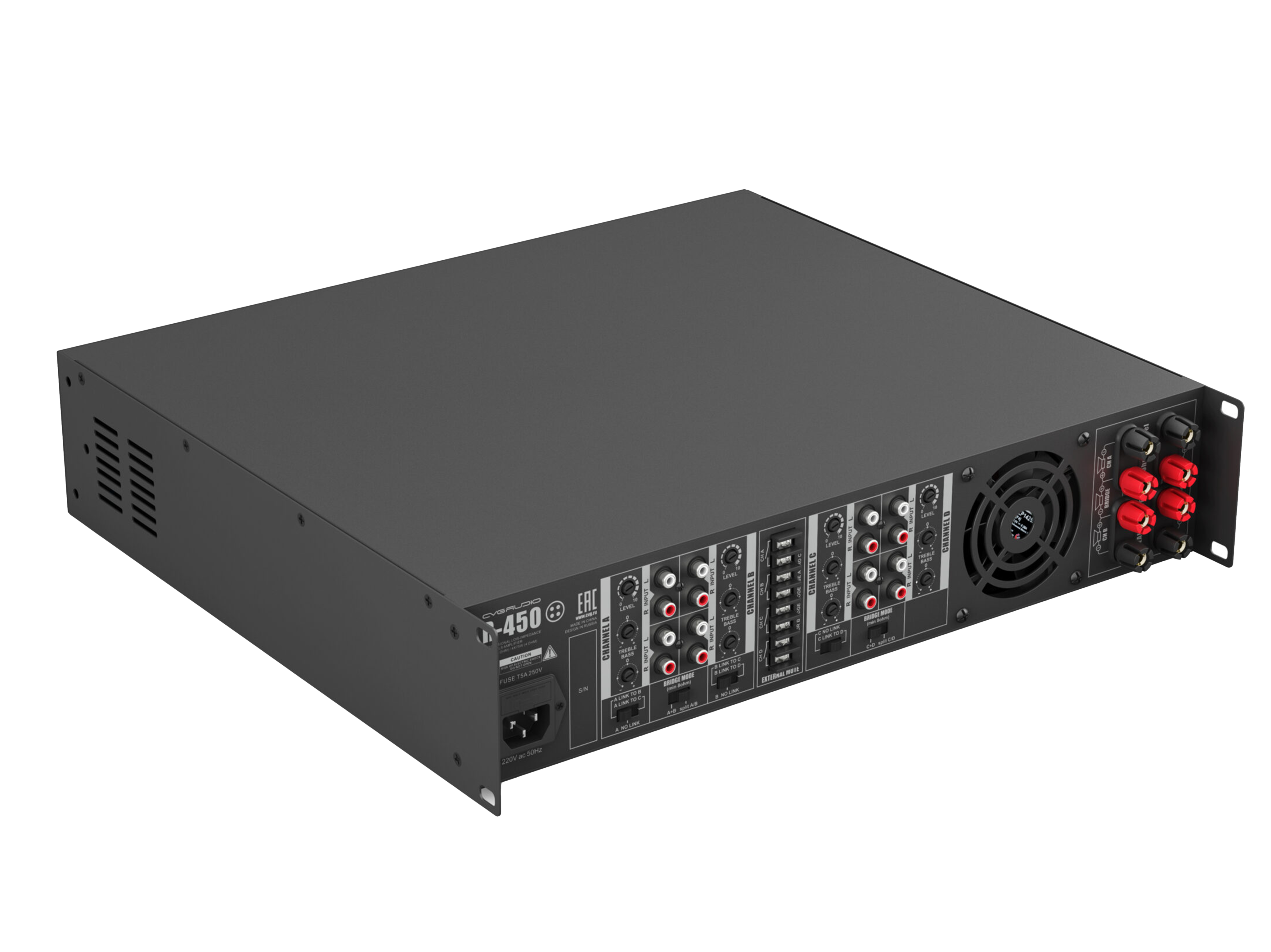 Профессиональный низкоомный 4-х канальный усилитель, мощность 4x50W/8ohm, 4x75W/4ohm, нагрузка 4-8ohm, input 4x2RCA, link 4x2RCA, EQ/EXT.MUTE для каждого канала, режимы split/bridge для A/B и C/D каналов, внутренняя маршрутизация сигнала, металлический корпус 2U, крепление в монтажный шкаф в комплекте. Активное охлаждение с зависимостью скорости вращения вентилятора от температуры нагрева радиатора транзисторов выходного каскада. Защита от короткого замыкания, перегрева, перегрузки, предохранитель по питанию