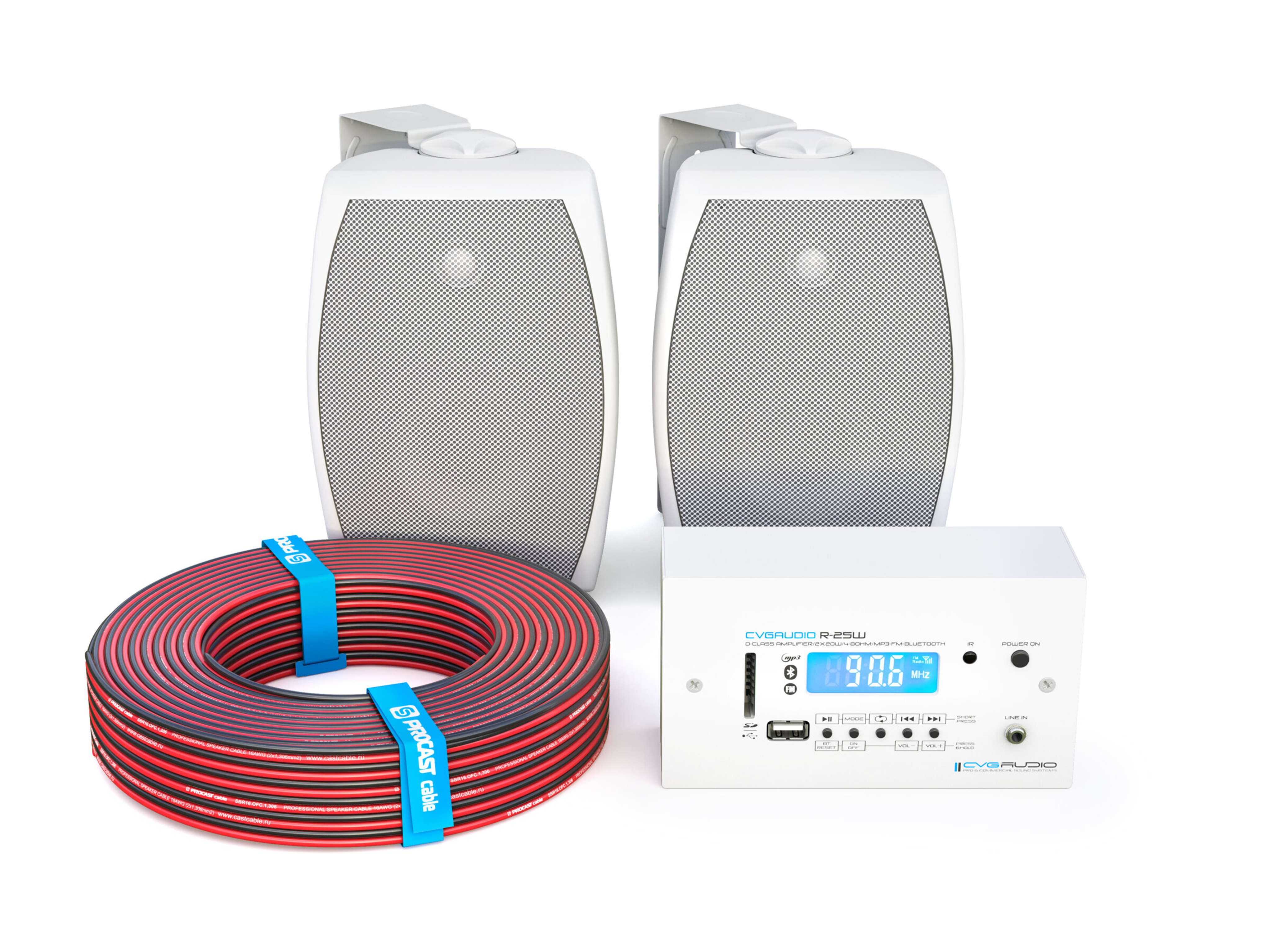 Комплект звукового оборудования и коммутации для системы трансляции фоновой музыки, две корпусные двухполосные АС, площадь озвучивания до 40m2. Усилитель 2х15W/8ohm, встроенный модуль плеера MP3-FLAC (USB-SDcard) / FM / Bluetooth, линейный вход для подключения внешних источников сигнала. Цвет акустики — белый.