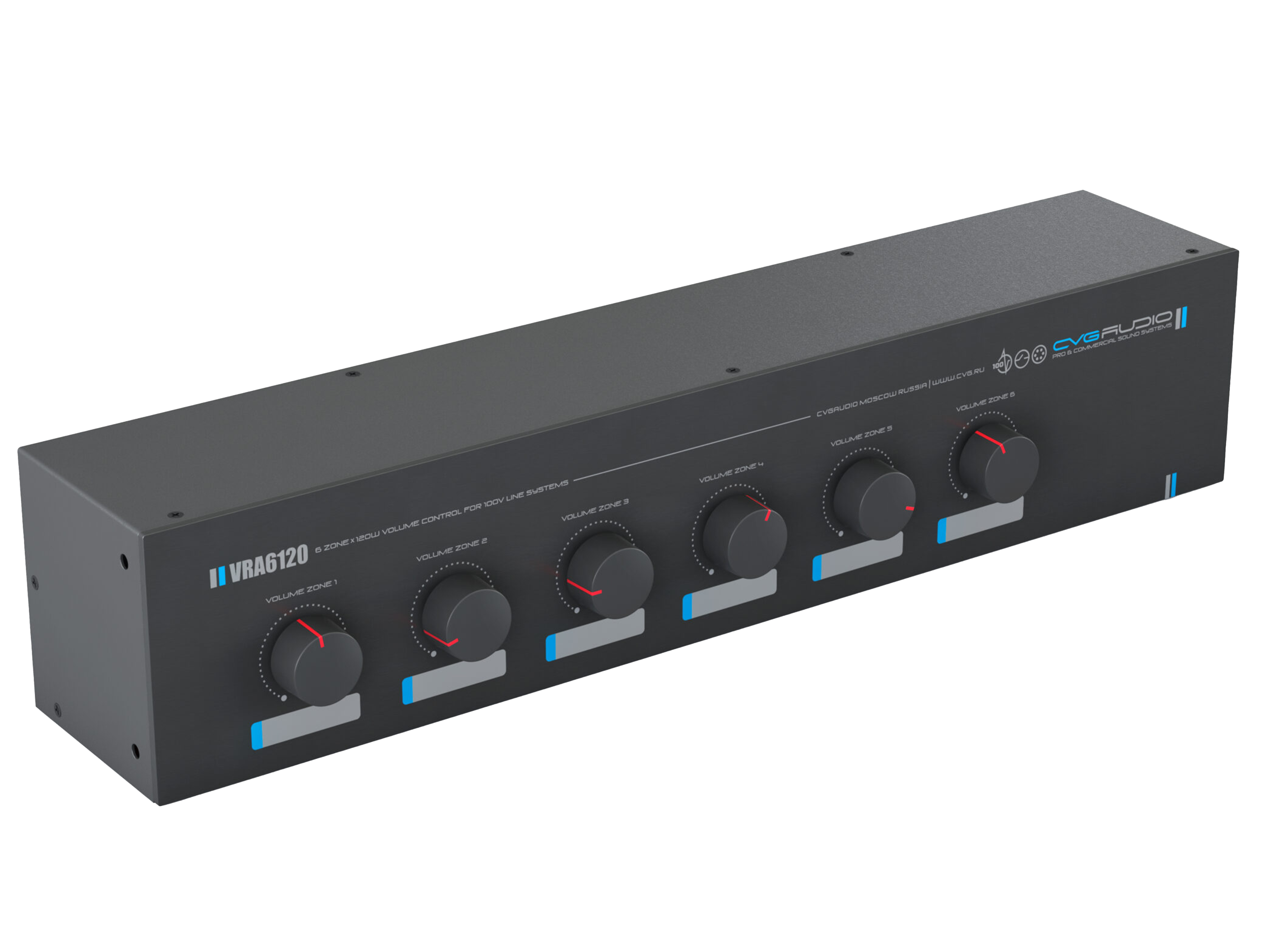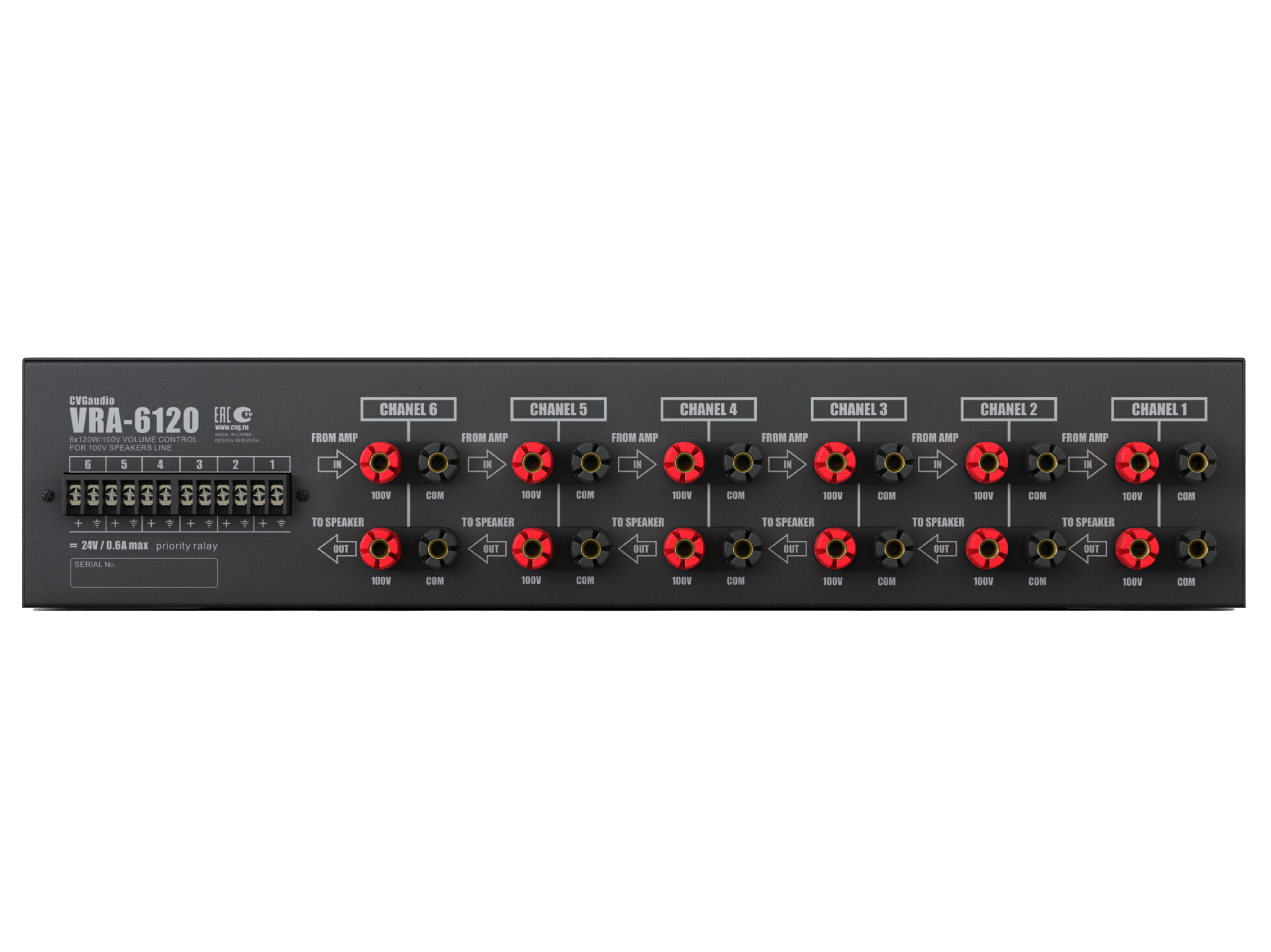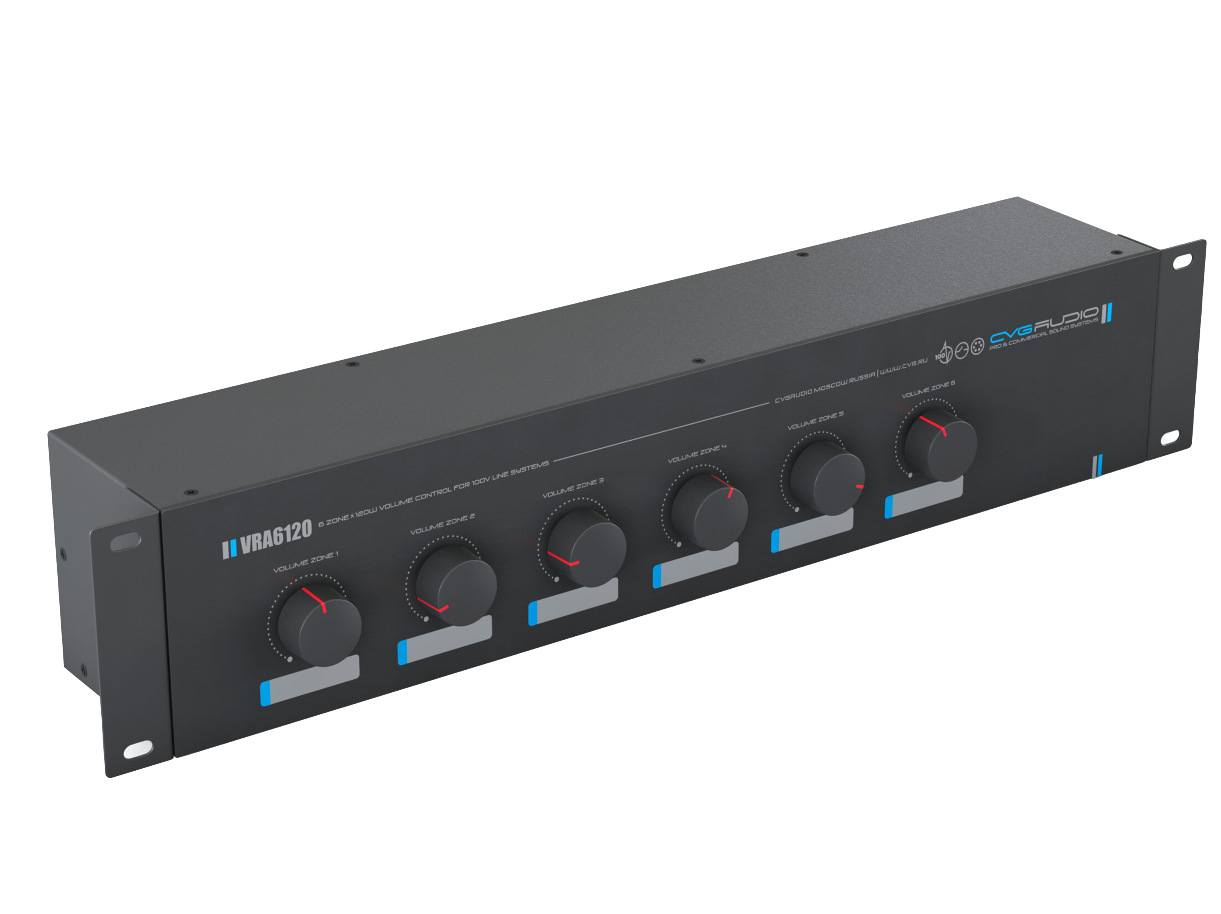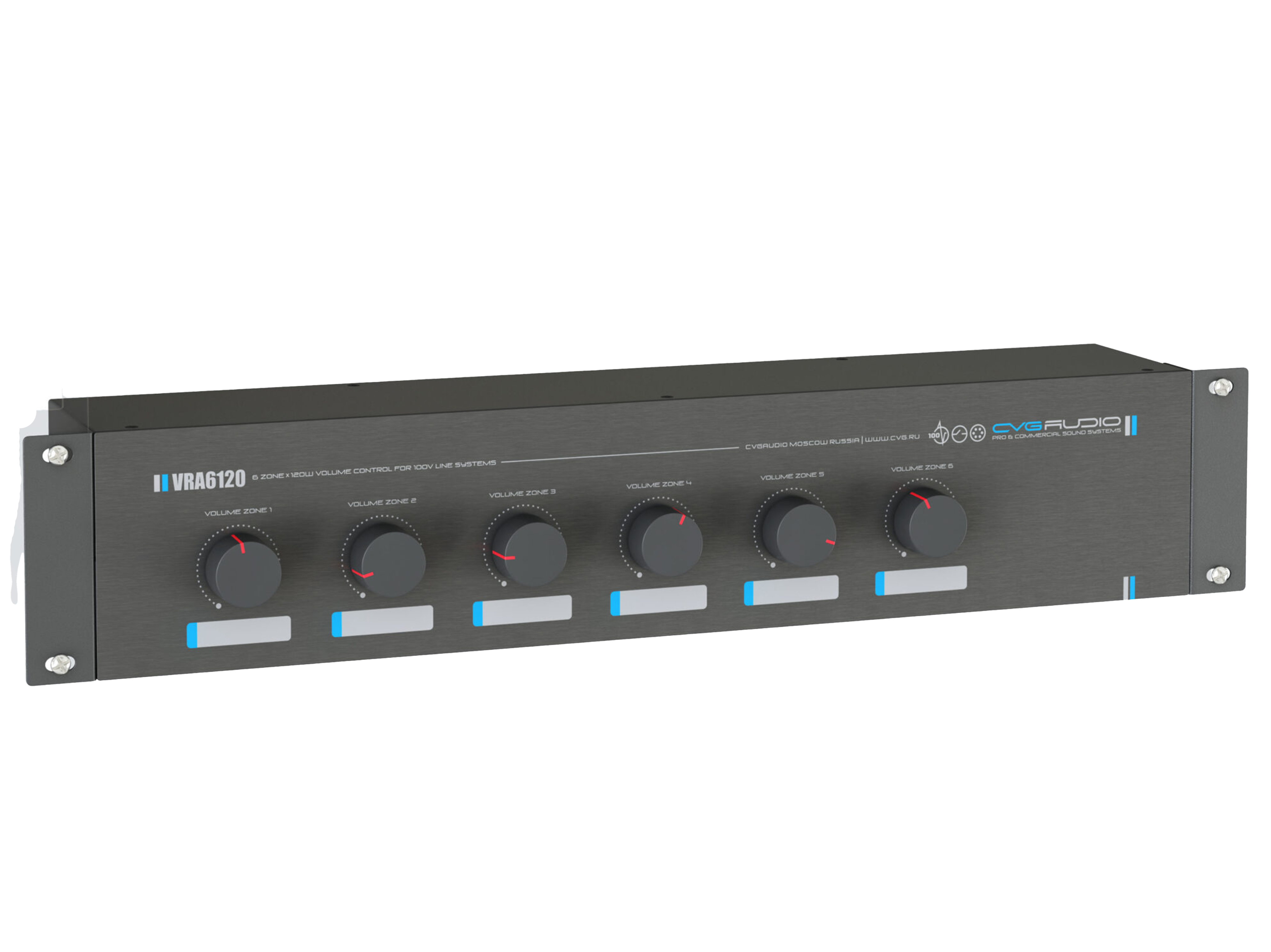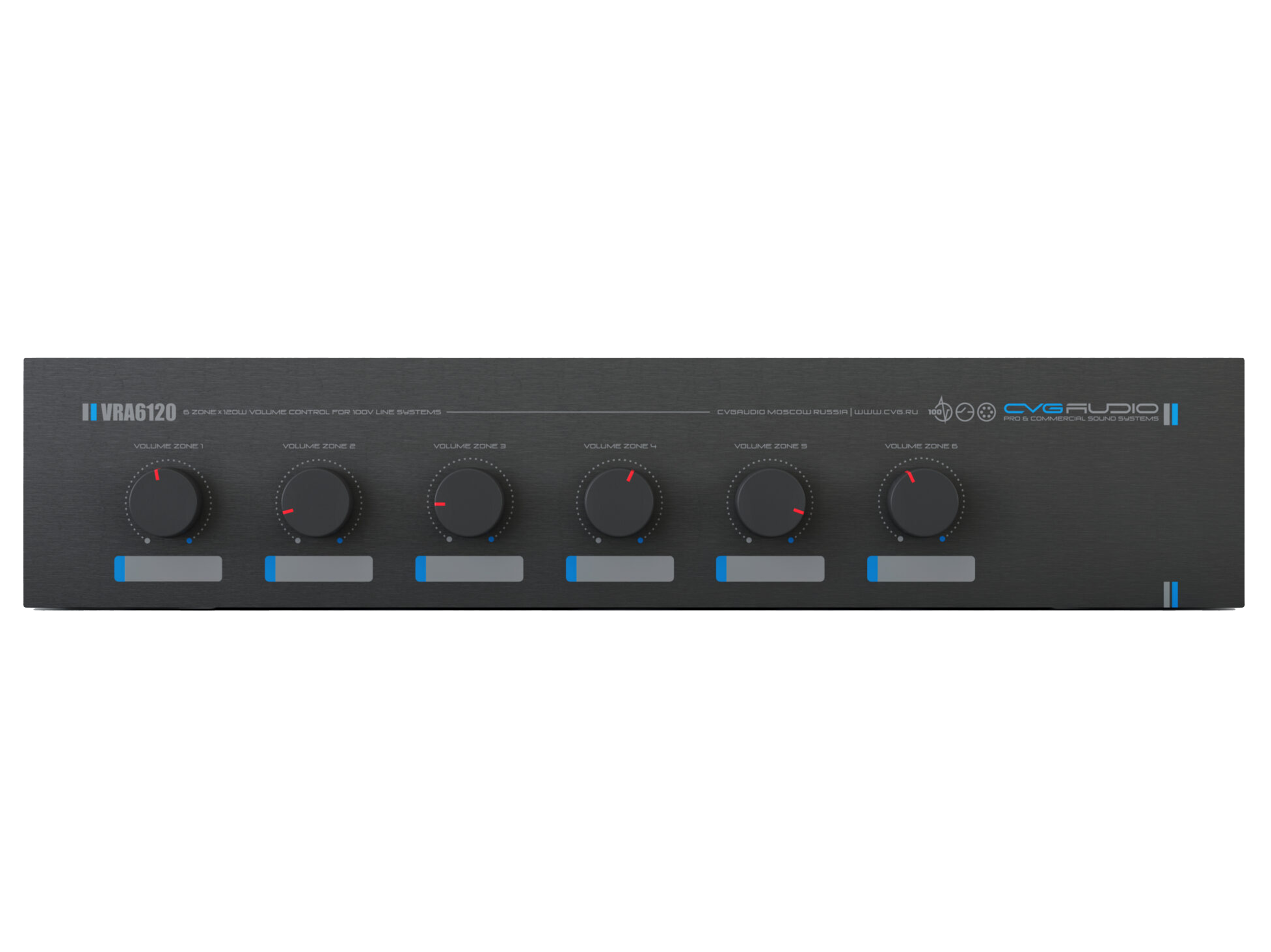 Шестиканальный, 2U-рэковый, 11-позиционный регулятор громкости для 100V трансляционных систем. Максимальная мощность нагрузки для каждого канала– 120W/100V. 24V/0.6A аварийное реле обхода индивидуально для каждого канала. Металлический корпус, габаритный размер — 430mm x 100mm x 88mm. Вес – 4,5kg.