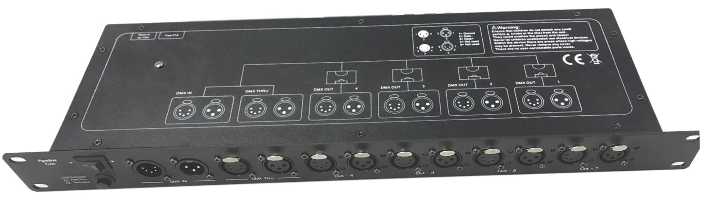 Сплиттер цифрового сигнала DMX512 1 вход, 4 выхода. Вес 1,9 кг. Габариты 482 X 135 X 44мм