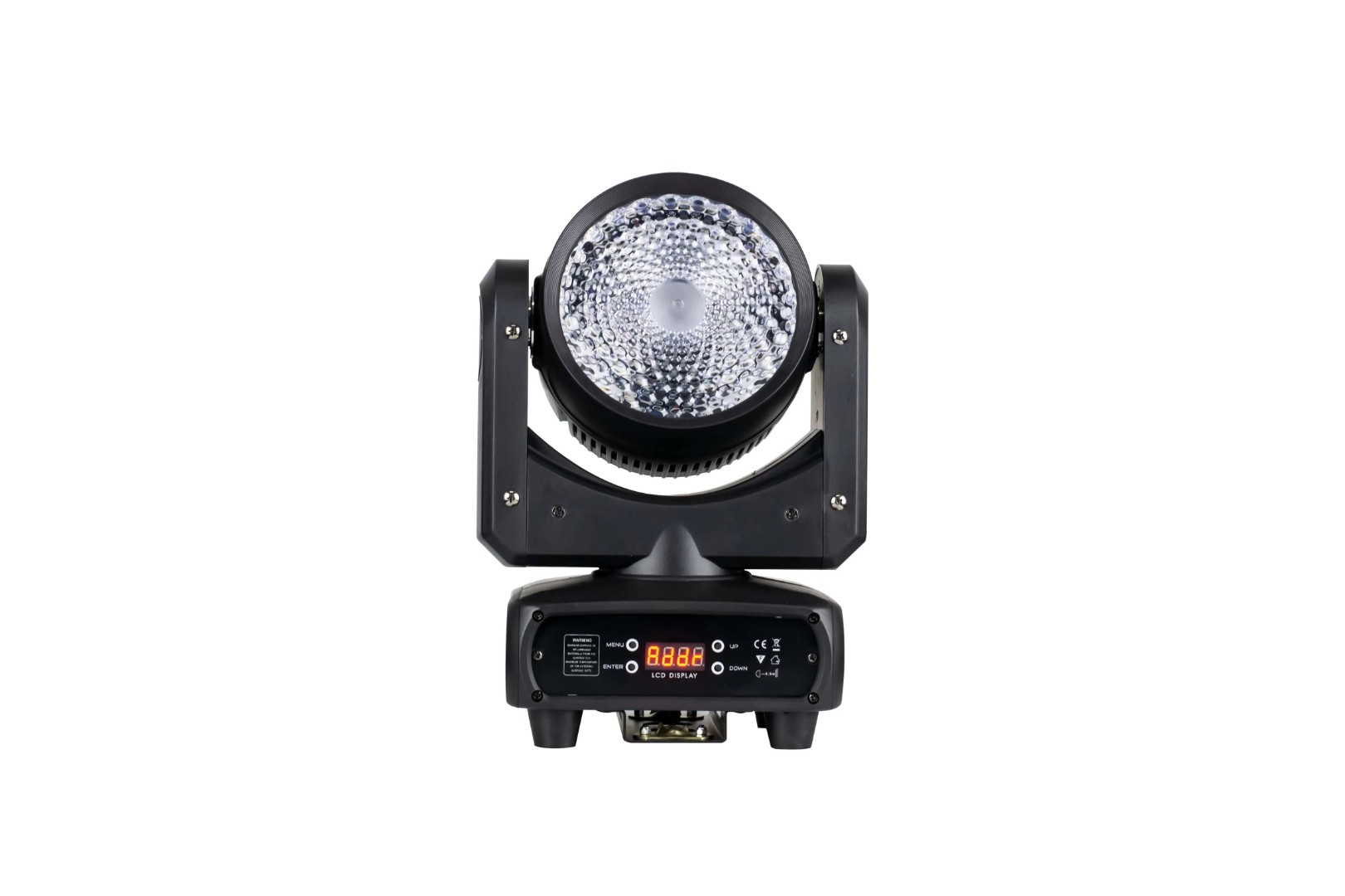 Вращающаяся голова Wash. Источник света светодиод 120Вт CW 5600K, WW 3200K, кольцо 5050 SMD LEDs (RGB). Угол луча 9°. Вращение Раn : 540°; Tilt 270°. Электронный диммер 0-100%. Управление: DMX512 20 каналов, звуковая активация, автоматический режим, master/slave. Питание: 100-240В 50/60Гц. Потребление: 140 Вт. Габариты: 270 x 145 x 155. Вес: 5 кг.