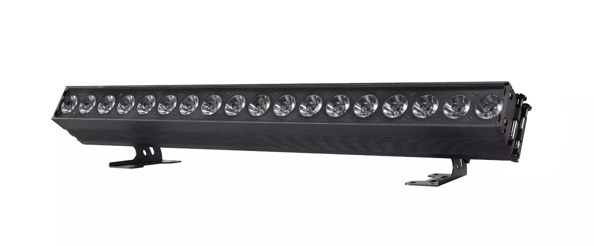 Источник света 18шт по 30 Вт RGBWAUV светодиодов. Угол раскрытия опционально на выбор 10°/12°/25°/40°. Управление Dmx512: 11/29/108/119 каналов (независимое управление каждым диодом), встроенные программы, RDM. Потребление 550Вт. Крепление в линию между приборами и вертикальная(напольная) установка (опциональные крепежи). Габариты 951x80x191 мм. Вес 9 кг.