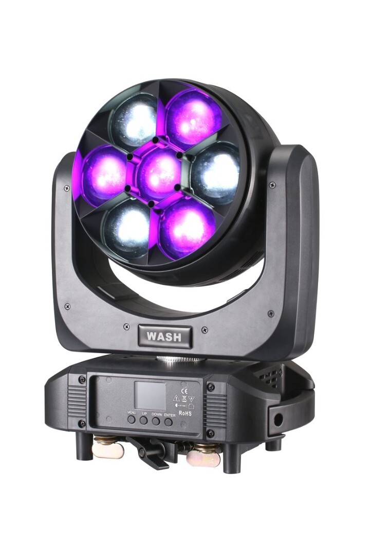 Вращающаяся голова Wash. Zoom: от 3° до 45°, 7 светодиодов RGBW по 60 Вт каждый. Попиксельное управление диодами. Димер 0-100%. Строб 0-25 вспышек в секунду. Управление: DMX512 (21/23/35/42/49/51/56), звуковая активация, автоматический режим, master/slave. Передняя линза имеет непрерывное вращение - эффект b-eye. Потребление: 500Вт. Габариты: 376 х 280 х 420. Вес: 16 кг.