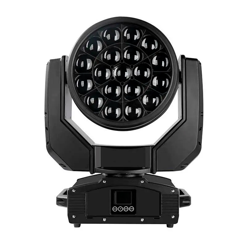 Вращающаяся голова Wash. Zoom: от 3,5° до 50°, 19 светодиода RGBW по 40 Вт каждый. Попиксельное управление диодами. Вращение Раn : 540/360°; Tilt 270°.Димер 0-100%. Строб 0-25 вспышек в секунду. Управление: DMX512 (19/27), звуковая активация, автоматический режим, master/slave. Передняя линза имеет непрерывное вращение - эффект b-eye. Защита IP 65. Потребление: 630Вт. Габариты: 434 х 532 х 298. Вес: 22 кг.