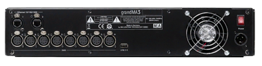 - Разъемы: 1 x powerCON TRUE1, 2 x etherCON/RJ45, 8 x выходDMX512-A (5pin XLR female), 3 xUSB 2.0 (typeA)