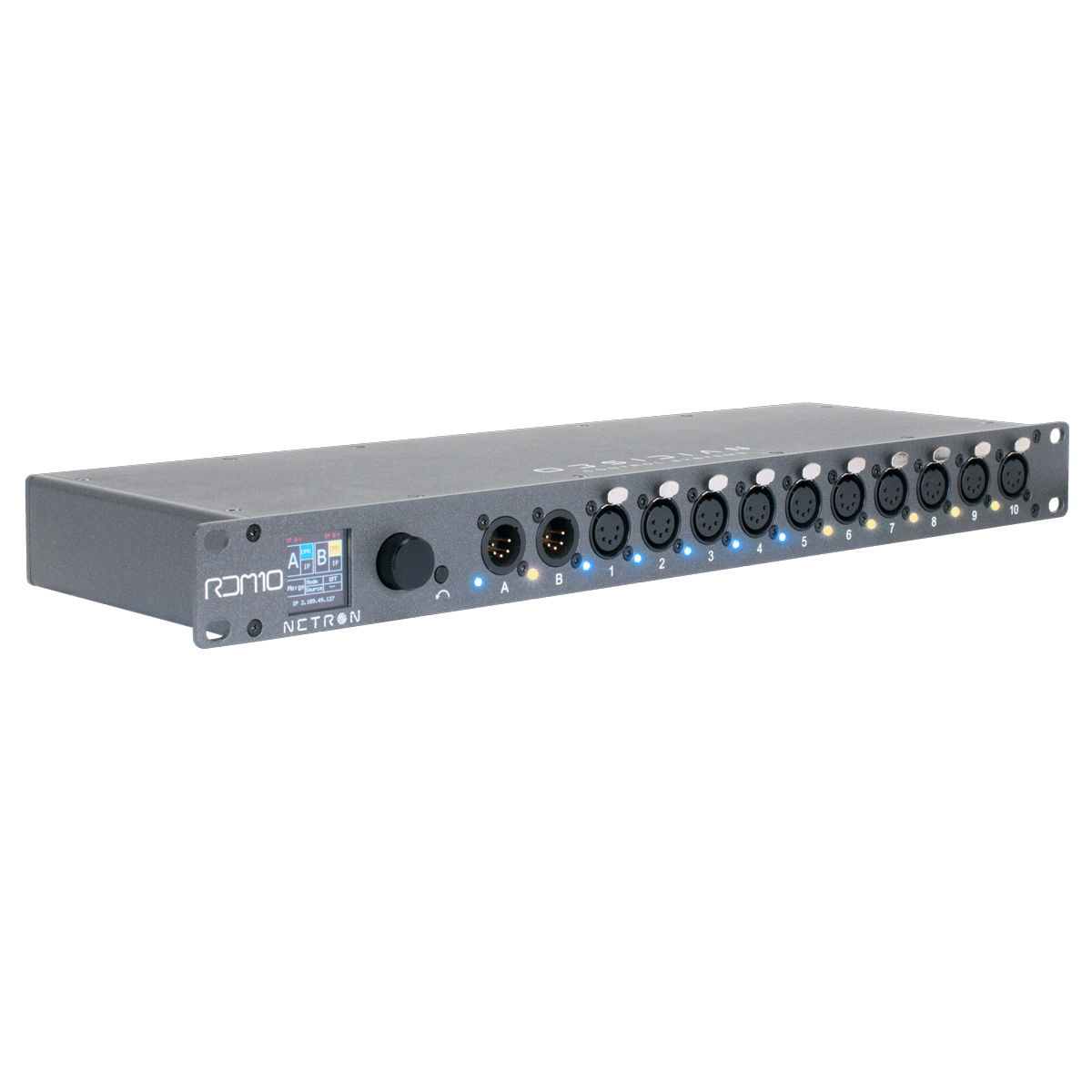 NETRON RDM10 - гибридный разветвитель. Двойной DMX-вход, 10-портовый RDM-разветвитель, Merger и EtherDMX-шлюз объединены в RDM10 с расширенным набором функций для широкого спектра применений. 99 внутренних настроек, заводские и пользовательские настройки, а также внешние замыкатели контактов обеспечивают уникальную комбинацию нескольких устройств для решения множества необходимых задач в одном мощном устройстве.