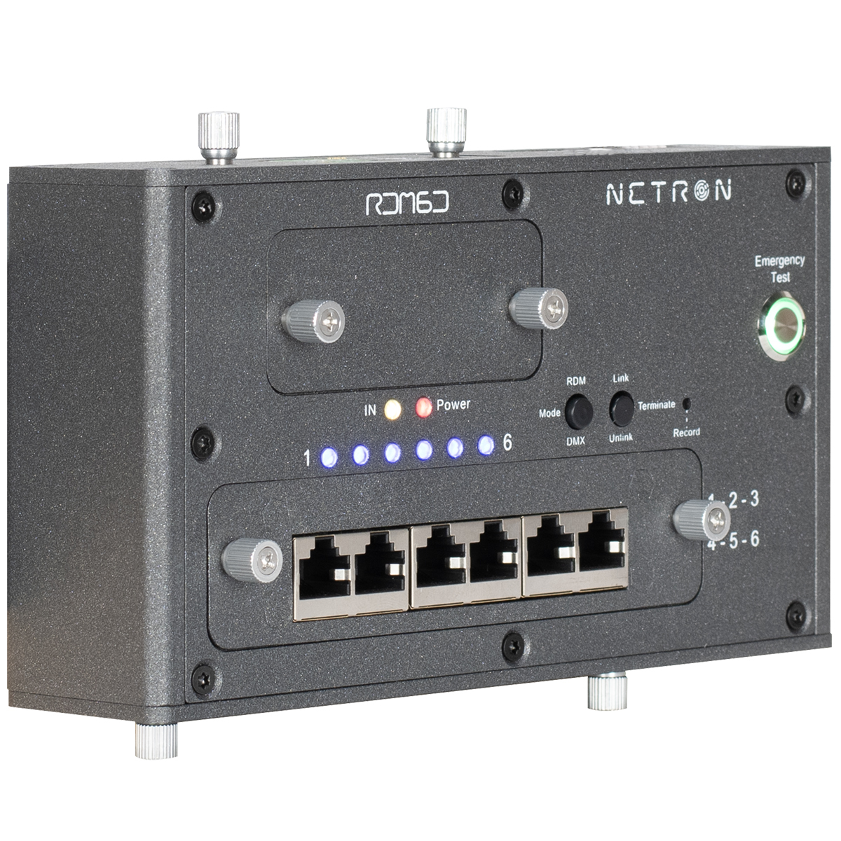 NETRON RDM6D соответствует стандарту UL924 и оснащен специальным аварийным сигналом, мокрым или сухим замыканием контакта и выступающей кнопкой тестирования со встроенной светодиодной обратной связью. Устройство позволяет записывать пользовательский сигнал или настраивать все каналы DMX на 100%. Время ожидания аварийного отключения может быть настроено индивидуально, а отдельные каналы могут быть исключены из аварийного сигнала.