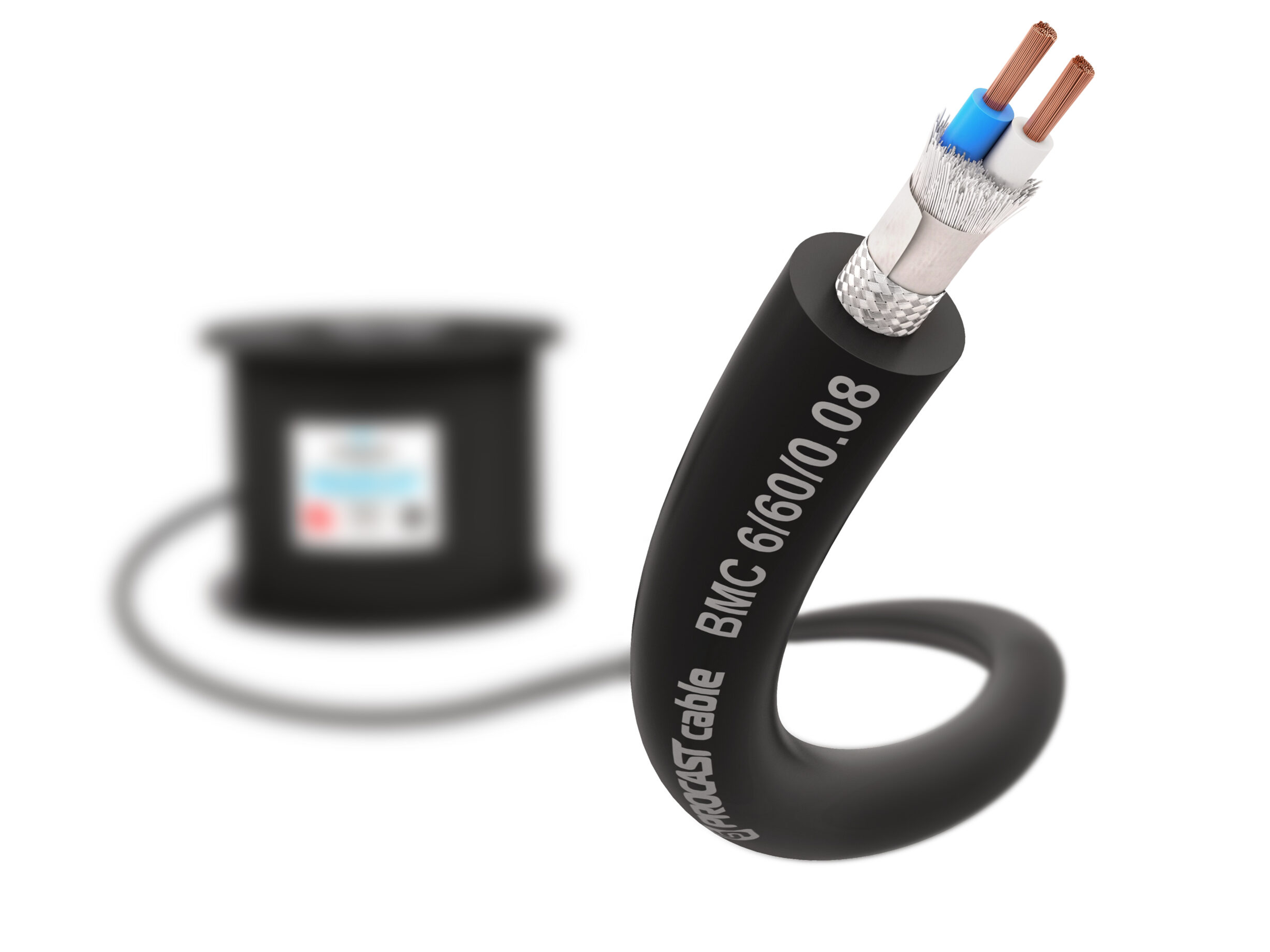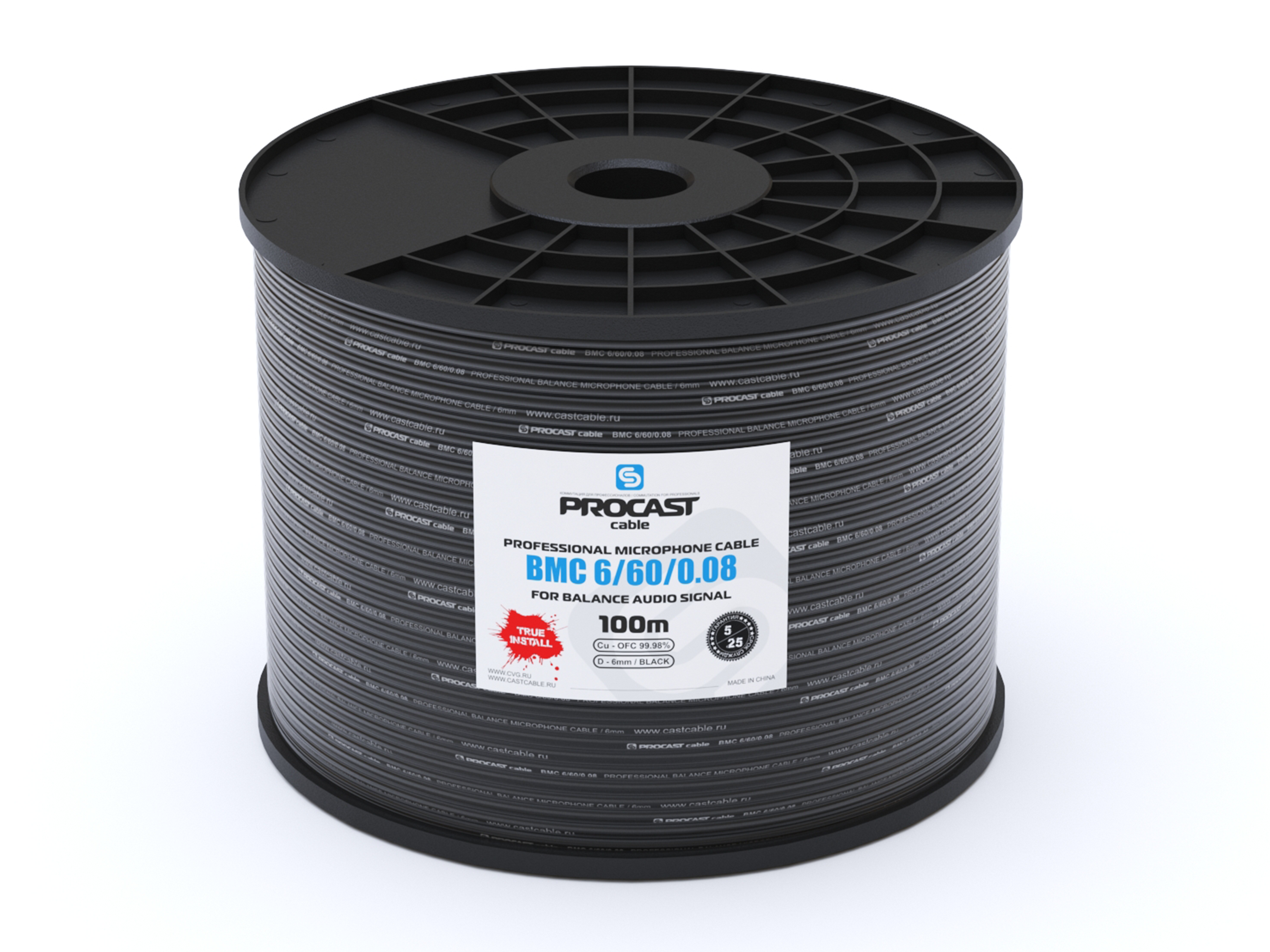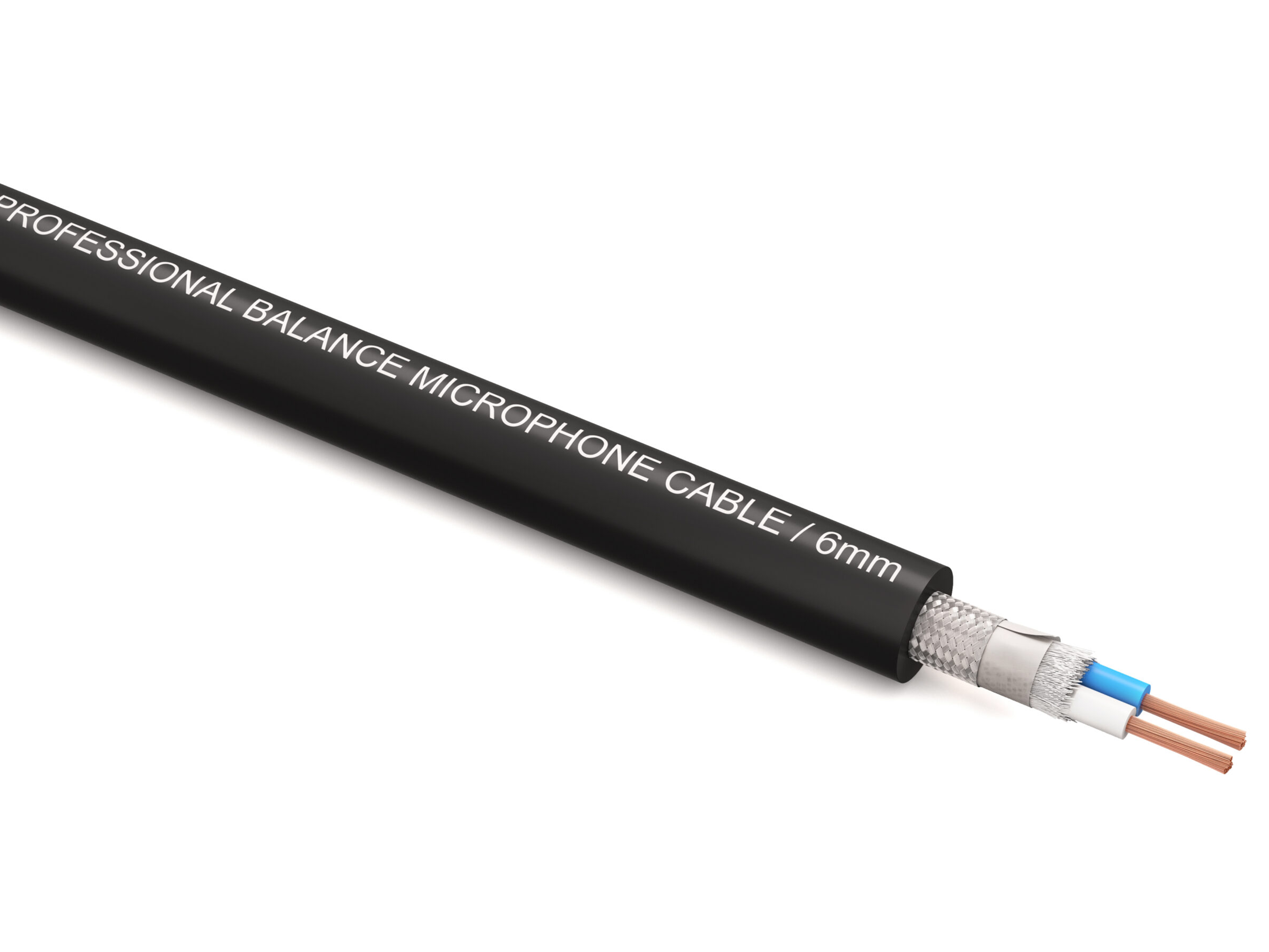 Профессиональный балансный микрофонный (сигнальный) кабель, диаметр 6mm, XLPE изоляция, [(60/0.08)Голубой XLPE+(60/0.18), белый XLPE]+BD16*9/0.10TC, черный, бухта 100m.