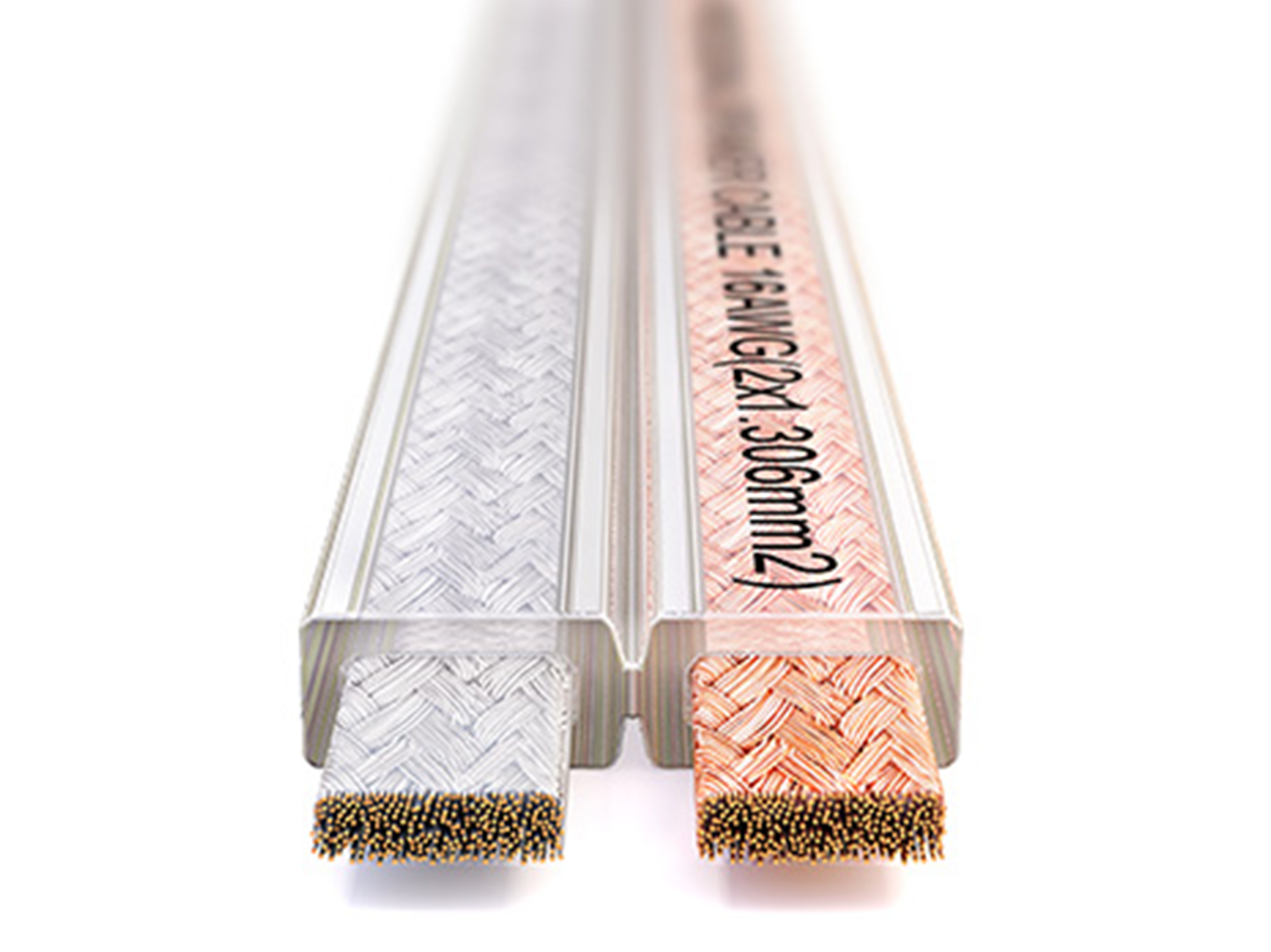 Плоский инсталляционный Hi-Fi спикерный (акустический) кабель, 16AWG(2×1,306mm2), внешняя изоляция — прозрачный PVC пластикат, одна жила луженая, структура жилы — 64/0,16mm, OFC (99,97%), бухта 100m, намотка на пластиковый барабан.