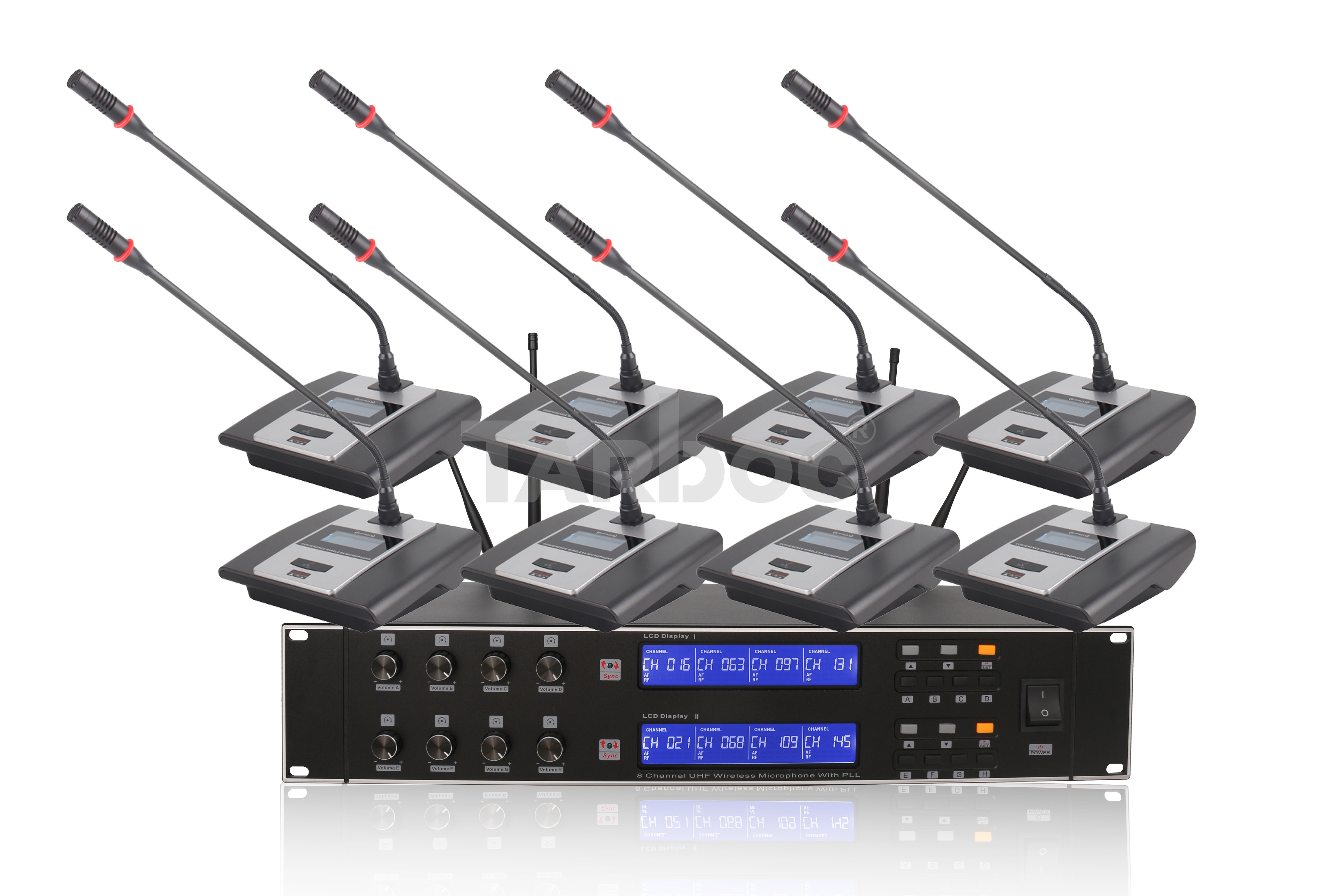 TARBOC ACT-8000 — 8-канальная беспроводная конференц-система на 8 микрофонов. Предназначена для организации аудиосопровождения конференций, совещаний и других мероприятий, где требуется одновременное использование нескольких микрофонов.