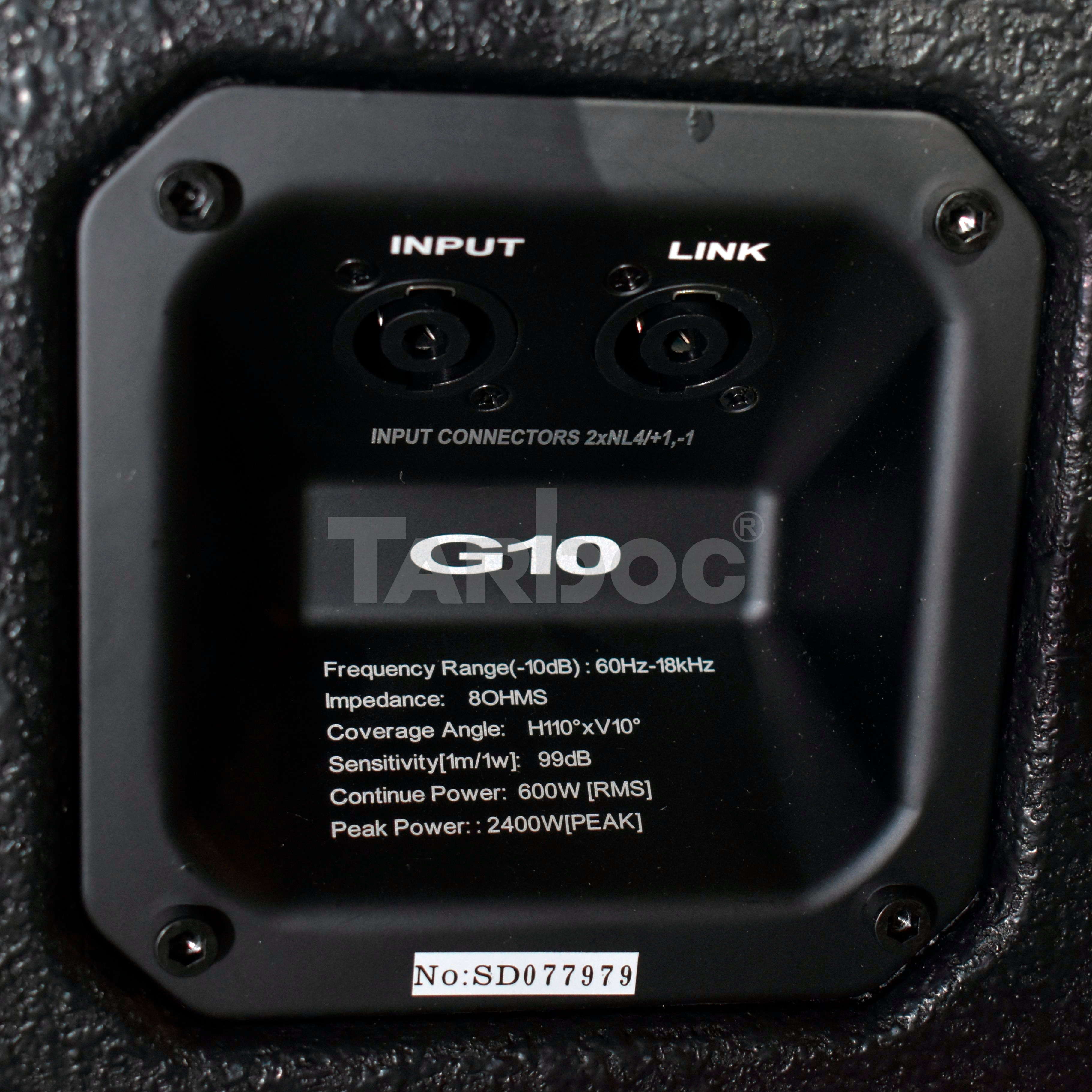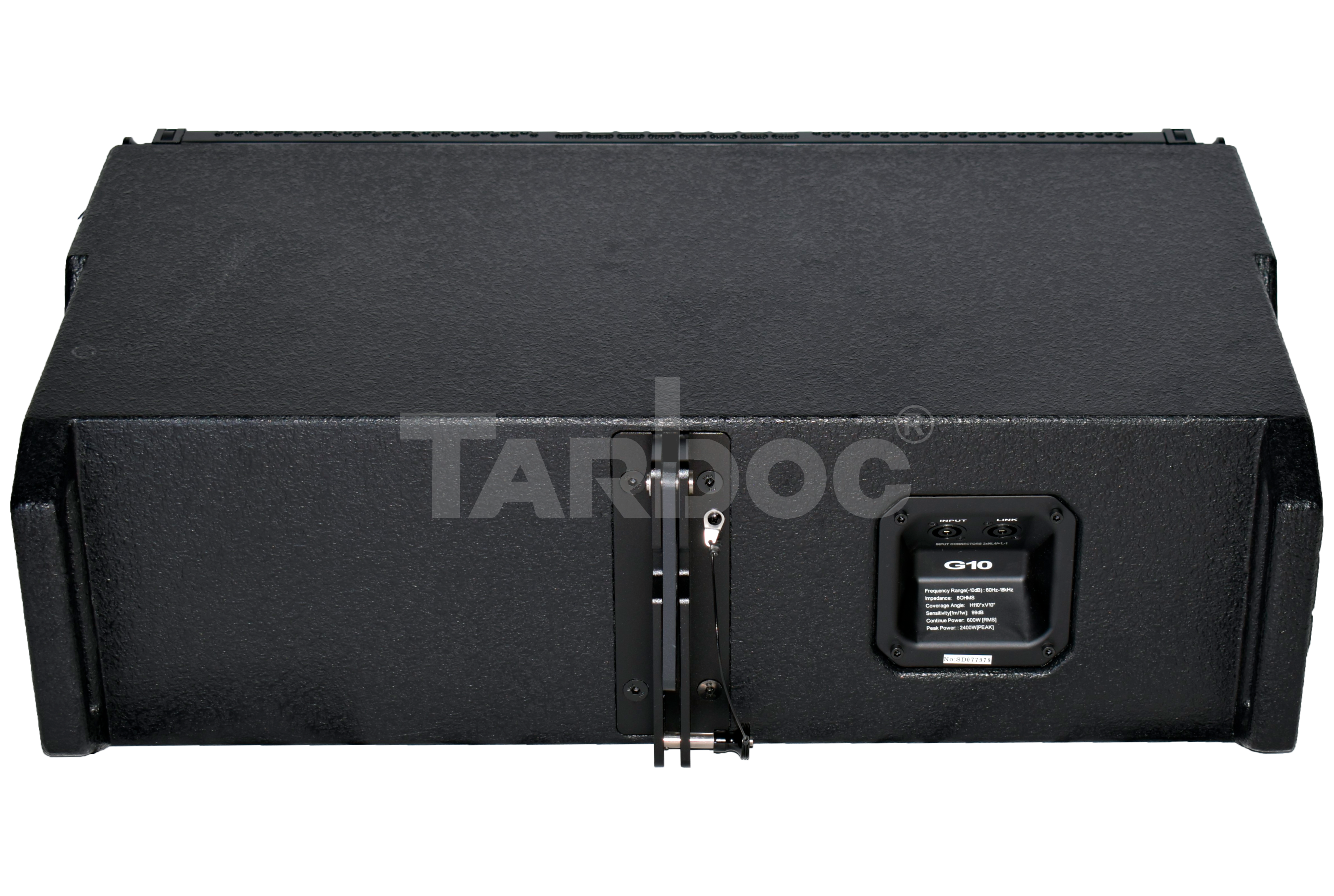 TARBOC G‑10 (MM‑1‑3348) — пассивная акустическая система линейного массива, предназначенная для профессионального звукового оформления мероприятий. Система сочетает мощность (600 Вт RMS, до 2 400 Вт пиковой), широкий частотный диапазон (от 60 Гц до 18 кГц) и высокий уровень звукового давления (до 128 дБ). Оснащена двумя 10‑дюймовыми динамиками с 65‑мм звуковыми катушками; корпус выполнен из берёзовой фанеры, имеет компактные габариты (795 × 460 × 284 мм) и чёрный цвет. Подключение осуществляется через два разъёма Speakon NL4, а углы наклона (100° по горизонтали и 10° по вертикали) позволяют гибко настраивать звуковое покрытие. Система подходит для концертных площадок, клубов и корпоративных событий, обеспечивая чистое и громкое звучание в больших пространствах.