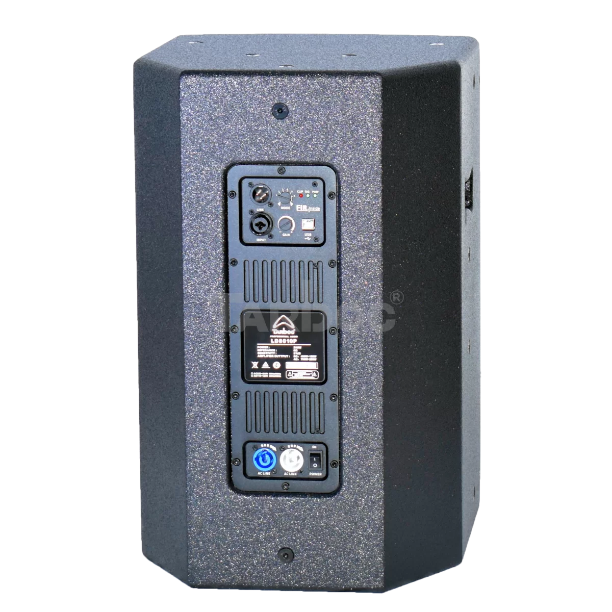 TARBOC LD‑8010P (MM‑1‑3408) — активная акустическая система серии LD, рассчитанная на сценические выступления и профессиональное звукоусиление. Оснащена 10‑дюймовым низкочастотным динамиком (диаметр катушки 100 мм) и 1‑дюймовым высокочастотным драйвером. Встроенный усилитель класса D с DSP выдаёт RMS‑мощность 300 Вт и пиковую мощность 1 200 Вт; при нагрузке 8 Ω выходная мощность составляет 400 + 150 Вт, при 4 Ω — 700 + 250 Вт. Частотный диапазон — 55 Гц–19 кГц, чувствительность (1 м/1 Вт) — 97 дБ, максимальный уровень звукового давления (SPL) — 127 дБ. Угол наклона подвеса (горизонталь × вертикаль) — 90° × 90°, что позволяет гибко настраивать направление звука. Питание — от сети 220–240 В (AC, 50–60 Гц). Корпус выполнен из берёзовой фанеры, решётка — металлическая, цвет — чёрный. Габариты корпуса — 370 × 340 × 535 мм, размеры упаковки — 420 × 390 × 580 мм.