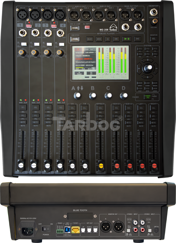 TARBOC MG‑208 (MM‑1‑3364) — цифровой микшерный пульт профессионального уровня для работы со звуком на концертах, в студиях, на мероприятиях и в других сферах, где требуется гибкое и качественное управление аудиосигналами.
