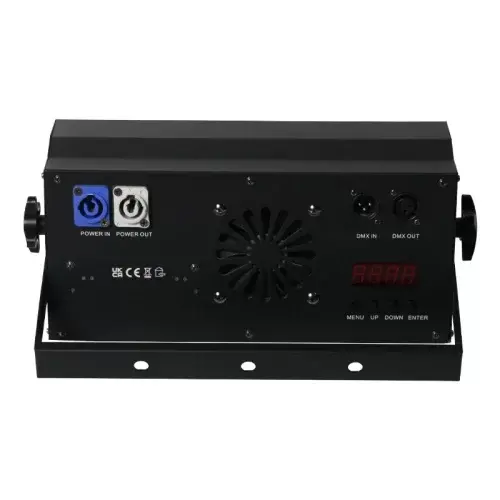Управление возможно через DMX‑512 (8 каналов), в режиме «Главный‑Ведомый» или с помощью голосового управления. Прибор работает от сети 90–220 В (50–60 Гц) и предназначен для использования внутри помещений (степень защиты IP20).