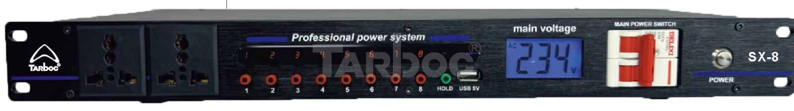 TARBOC SX‑8 (MM‑1‑3436) — таймер питания для управления электропитанием профессионального аудио‑ и светового оборудования. Имеет 8 управляемых каналов и 2 розетки прямого включения, суммарная мощность — 6000 Вт (по 2000 Вт на канал). Рабочее напряжение — 90–260 В (AC 50–60 Гц), максимальный ток — 13 А на розетку. Оснащён ЖК‑дисплеем, USB‑портом 5 В/500 мА, LC‑фильтром для подавления ВЧ‑шума и защитой от перегрузки. Предусмотрены функции последовательного включения/отключения, кнопка PASS для активации всех каналов, точный вольтметр. Корпус металлический, чёрный, размеры — 480×158×48 мм, вес — 2,5 кг. Подходит для сценического оборудования и студий, защищает технику от скачков напряжения и снижает фоновый гул.