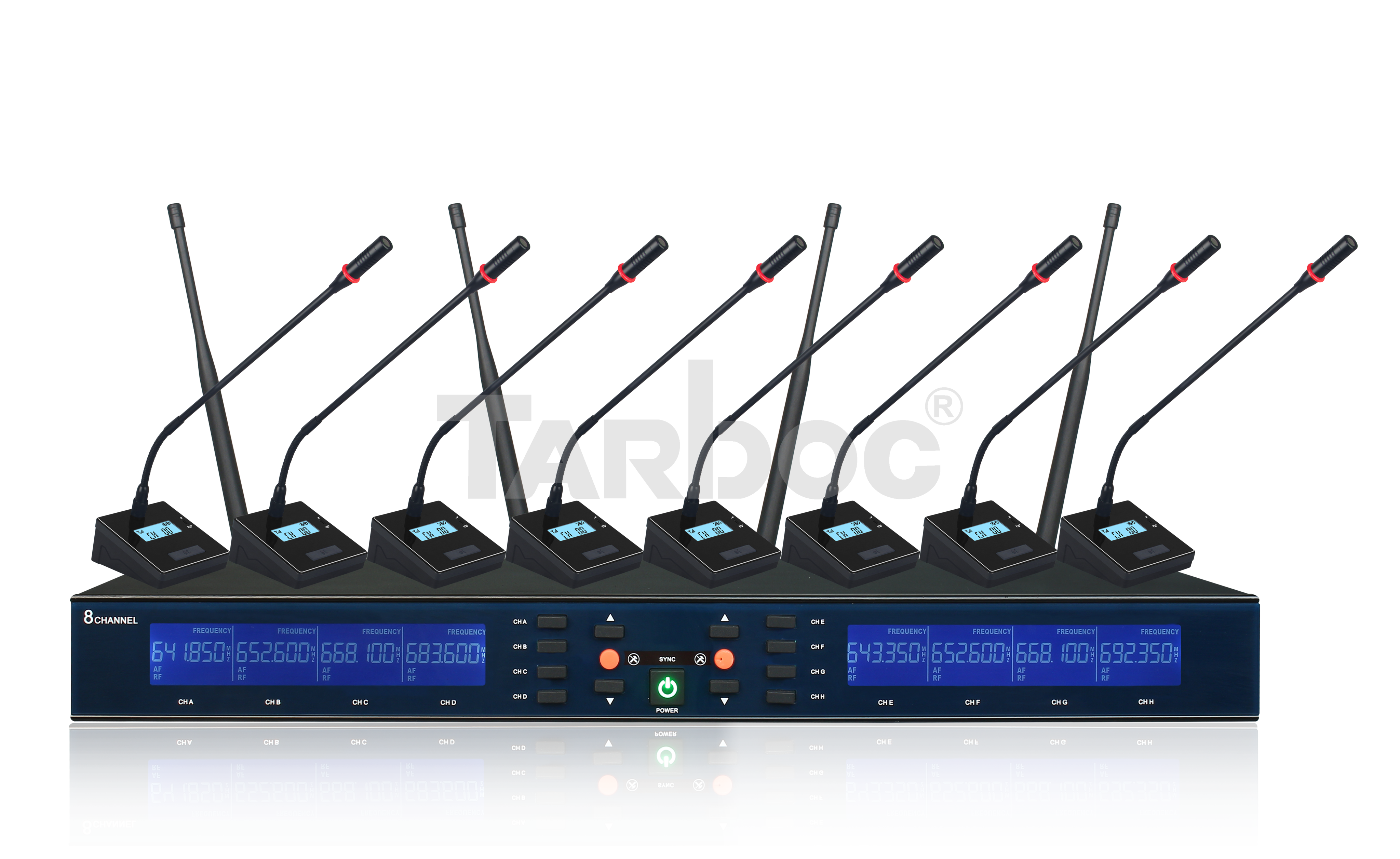 TARBOC U‑M8100 — беспроводная 8‑канальная конференц‑система, обеспечивающая качественную передачу звука на расстоянии до 80 м. Оснащена технологиями автоматического поиска и различения частот помех, цифровой схемой частотной проводимости UHF и ультравысоким частотным диапазоном беспроводной передачи (640–690 МГц). Система отличается низким уровнем искажений (< 0,3 % при 1 кГц), широким частотным диапазоном (50 Гц – 15 кГц) и высоким отношением сигнал/шум (> 105 дБ). Имеет металлическое 1U‑шасси со встроенным двухканальным приёмником и функцией инфракрасного сопряжения. Микрофоны (ручные и поясные) работают от батарей до 10 часов, а специальная схема отключения звука исключает ударные шумы при включении/выключении.
