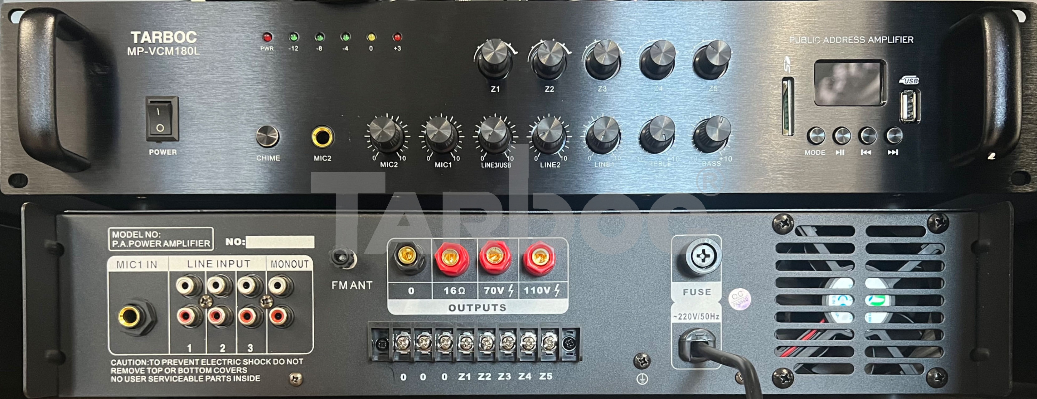 TARBOC VCM‑250L (MM‑1‑3331) — трансляционный усилитель мощностью 250 Вт для систем речевого оповещения и фонового озвучивания. Работает от сети 220 В.