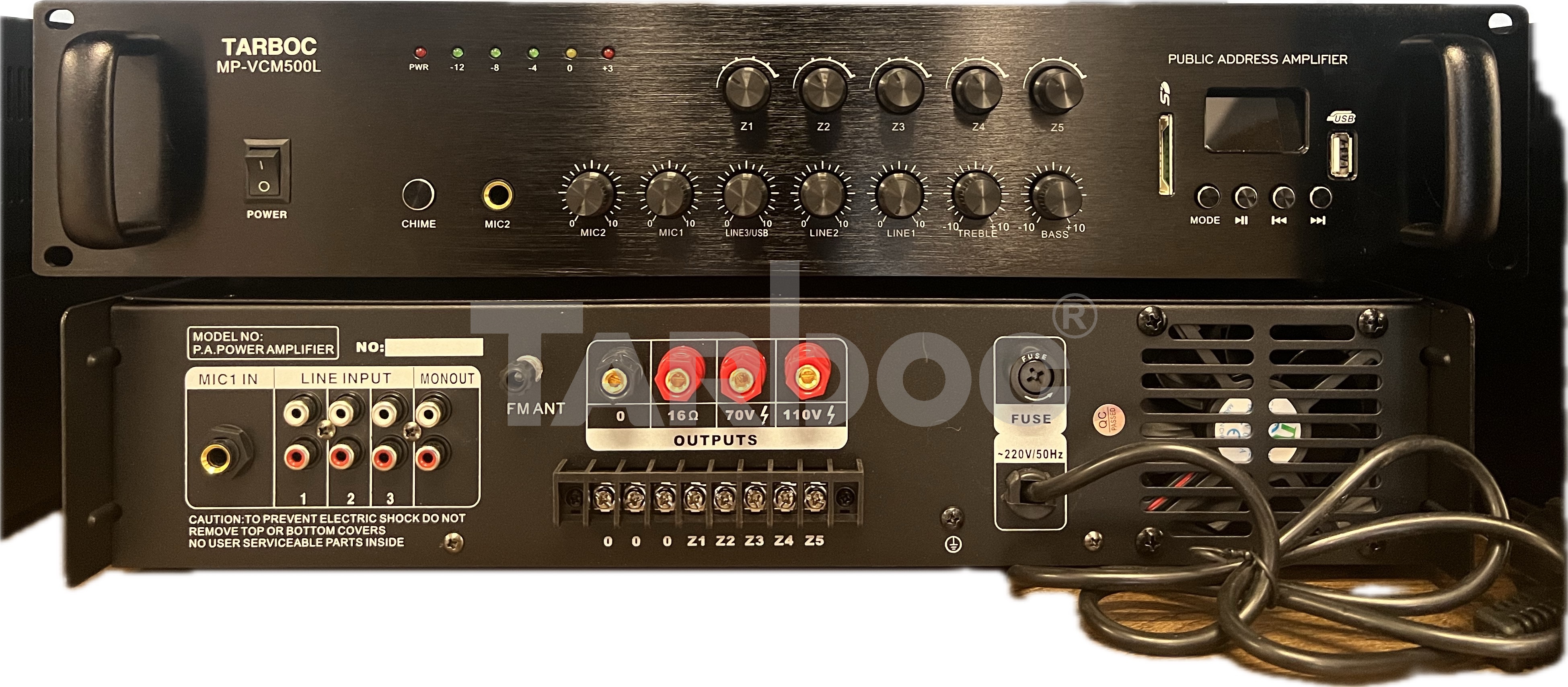 TARBOC VCM‑500L (MM‑1‑3333) — трансляционный усилитель мощностью 500 Вт для систем оповещения и фонового озвучивания. Работает от сети 220 В.