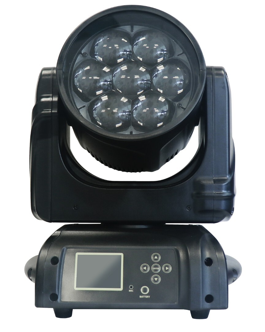 Вращающаяся голова Wash. Zoom: от 6° до 50°, 7 светодиодов RGBW OSRAM по 40 Вт каждый. Попиксельное управление диодами. Вращение Раn : 630°; Tilt 265°.Димер 0-100%. Строб 0-25 вспышек в секунду. Управление: DMX512 (26/38/8/28}, звуковая активация, автоматический режим, master/slave. Потребление: 280Вт. Габариты: 286 x 245 x 372 мм. Вес: 7,4 кг.
