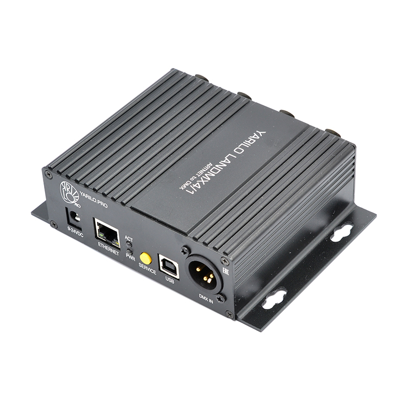 ЯRILO LANdmx4/1 - ART-NET DMX конвертер компании ЯRILO Pro на 4 выхода DMX-512 (2048 каналов) и один вход DMX-512. LANdmx4 принимает 4 пространства DMX по локальной сети и выводит на 4 изолированных выхода DMX-512. Со входа DMX данные передаются в локальную сеть по протоколу ARTNET.